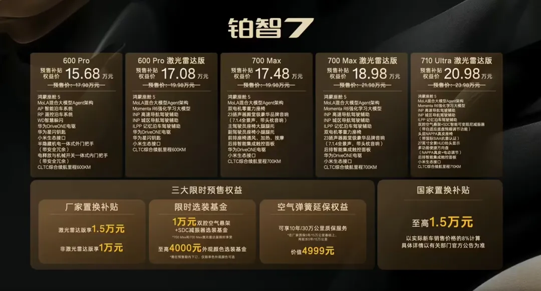 3月5日,就在刚刚广汽丰田铂智7正式开启预售,新车一共推出5款配置,预售价格区间17.98-23.98万元,限时预售权益价区间15.68-20.98万元。这个价格对于市面同级别车型简直是降维打击!丰田铂智7作为一款中大型D级轿车,车身尺寸长宽高分别为5130x1965x1506mm,轴距为3020mm,外观方面,采用家族电动化设计语言,封闭式前脸,进气格栅在前唇正上方,C字形贯穿前灯带,两侧T字形分体大灯,前脸设计层次分明,简洁大气沉稳。车身一共提供7种颜色车漆,包括黛云翠、丹霞红、赛博金、粹雪白、皎月银、浩瀚黑、远山灰等。车身侧面来看,流畅的车身线条搭配溜背式造型,采用20英寸多幅轮毂,尾部依旧是贯穿式灯带,尾部集成小型扰流板设计,两侧切割造型点缀首尾呼应,整体美观协调。动力与续航方面,丰田铂智7全系采用单电机纯电直驱方式,电机采用华为Drive One技术,最大输出功率207千瓦,提供88.13kWh、71.35kWh两种中航新航磷酸铁锂电池组可供选择,对应CLTC续航里程区间在600-710公里。新车全系标配鸿蒙智能座舱5.0系统,搭载MoLA 混合大模型 Agent 架构,能够完成“长期记忆与主动服务”功能、华为星闪钥匙、小米车载智能软硬件生态等中控采用15.6英寸LCD LTPS屏,支持华为/安卓/iOS全生态互联,支持模糊语义理解、长期记忆与主动服务,可识别多用户习惯,实现全家个性化设置,覆盖主流5万+手机生态,支持一碰传、远程控车等。全系标配HUD抬头显示、无框车门、隐藏式门把手、后排隐私玻璃、车载冰箱,前后排50W无线充电。雅马哈2360瓦全景声音响系统,7.1.4立体环绕声,共23个扬声器。全车四座标配通风、加热、10点按摩按摩功能(5种模式+4档力度)。前排标配双电机零重力座椅,采用一体式无缝腿托,支持多模式调节,采用NAPPA真皮与抗菌面料,通过SIAA抗菌认证,舒适性与健康防护兼备。后排单侧小桌板和后排独立空调等。三道密封车门,四门双层夹胶隔音玻璃,全车80多处隔音棉,再次颠覆日系车NVH水平低的观念。还配备有同级少有空调高温杀毒功能,PM2.5滤芯,智能香氛系统,AQS空气质量传感器等配置细致到每一个细节!内饰设计采用号称北美百年白栓木饰板,搭配与奔驰S级同源的NAPPA真皮座椅,并在2025年一举斩获CMF国际设计至尊金奖(设计界奥斯卡)!智能辅助驾驶方案采用Momenta R6飞轮强化学习大模型高阶辅助驾驶系统,搭配全车27个硬件传感器,1个激光雷达,5个毫米波雷达,11个高清摄像头,10个超声波雷达等,支持城市 NDA 领航辅助、高速 NDA 领航辅助(支持城市快速路场景)、自动泊车 FAPA、遥控泊车 RPA、记忆泊车 HPA、透明底盘等功能。底盘素质方面,铂智7还会搭载双腔空气弹簧,可实现车身高度与悬架软硬的独立调节,“智能预瞄”功能的加入,集成道路预判功能,主动调整悬架状态,再搭配SDC可变电子阻尼减震器,由丰田GR和雷克萨斯团队联合调校,提升驾乘体验。最后,铂智7全面延续「厂家三担责」政策,厂家直接承担电车自燃责任,厂家直接承担电池衰减责任,厂家直接承担智能泊车辅助事故责任!