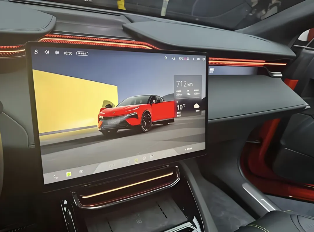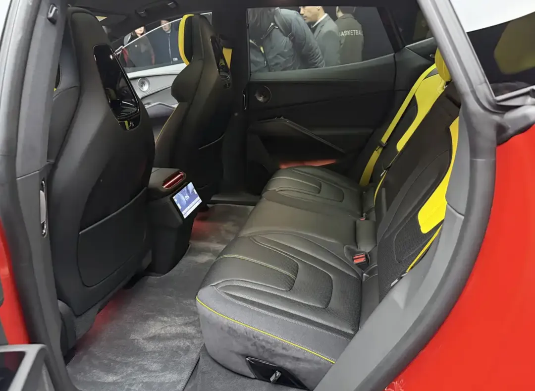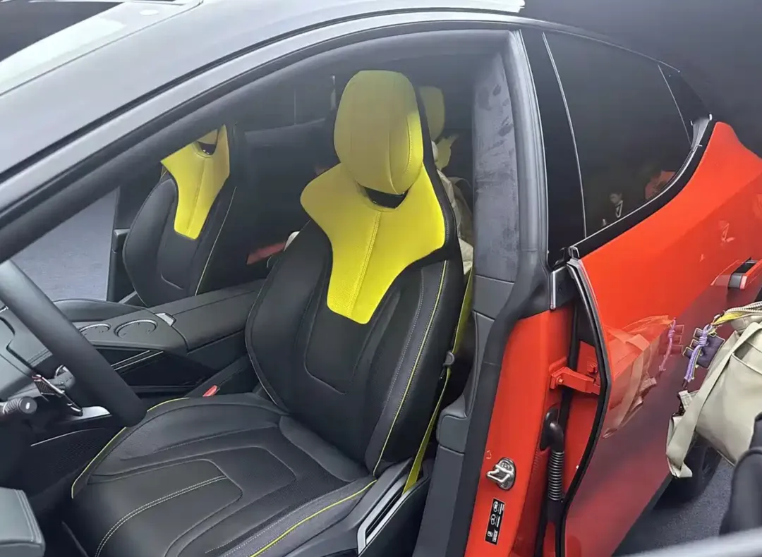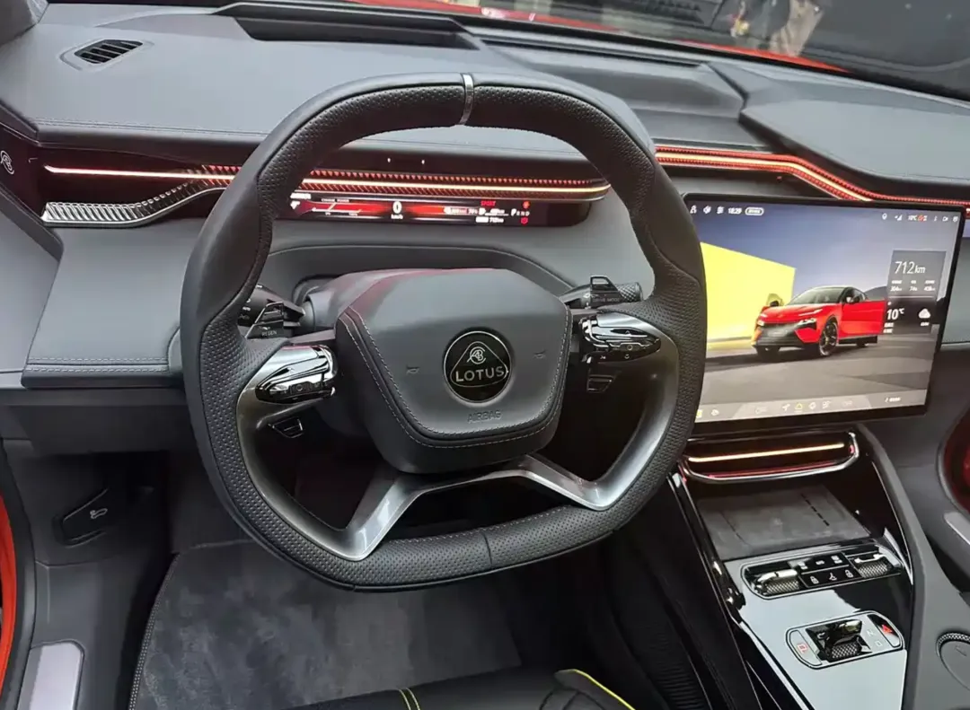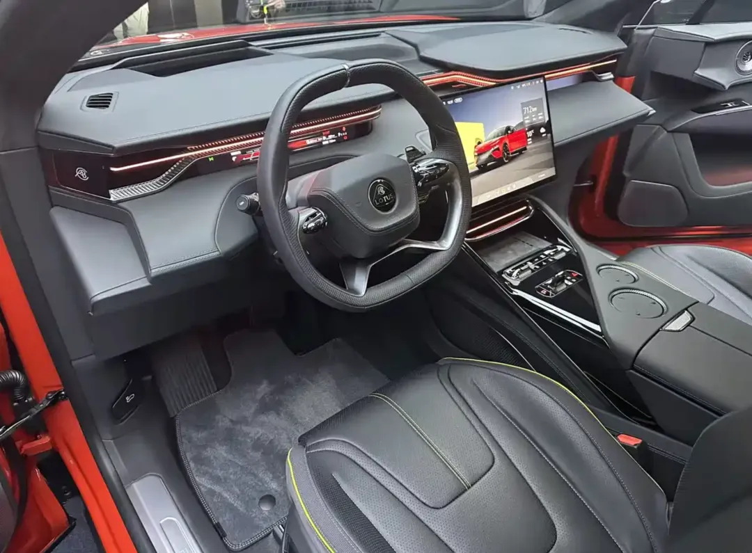 进入车内,莲花For Me的整体布局与纯电版车型ELETRE基本一致,整车采用了大面积黑灰色Alcantara面料铺陈,中控台和四周门板都采用了黑色碳纤维饰板,外部加入黑色真皮材质,并通过黄色的手工缝线进行完美缝合。再配上黄色+黑色拼接的前排桶装赛车座椅,后排沙发座椅,营造出更加浓郁的赛车气息。中控台配备了Lotus专属的四辐式多功能赛车方向盘,内侧采用了真皮打孔材质,外侧采用了麂皮绒材质交替缝合,带来了更好的手感,也拥有更加出色的防滑吸湿效果。两侧还加入了造型独特的换挡拨片,操控岛更加简约,前方是手机无线充电模块组,后方加入了两个滚轮,再往后就是小尺寸换挡拨杆,整体造型具有不错的未来感。科技感方面,该车集成仪表盘、中控与副驾娱乐于一体,支持多用户交互与分屏显示,拥有4K的高分辨率,还有120赫兹的高刷新率,支持触控与手势控制。还加入了AR-HUD抬头显示系统,将导航、车速、ADAS信息投射至前挡风玻璃,与真实道路融合。基于高通骁龙8295芯片组,还支持时下主流的手机互联系统。