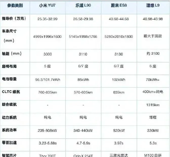 你要是年轻、爱科技,小米YU7闭眼冲;你要是带娃、爱省心,乐道L90最稳;你要是商务咖、要面子,蔚来ES8不亏;你要是常跑长途、怕没电,理想L9就是命根子。