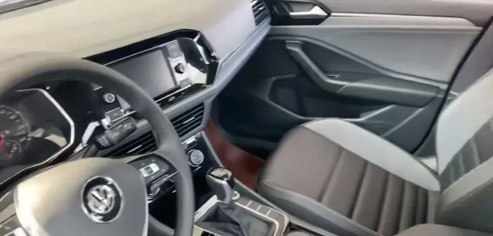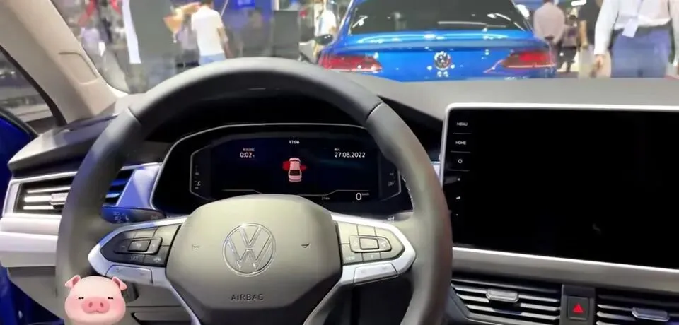 “展示大众宝来轿车内饰,方向盘设计,中控显示屏。”