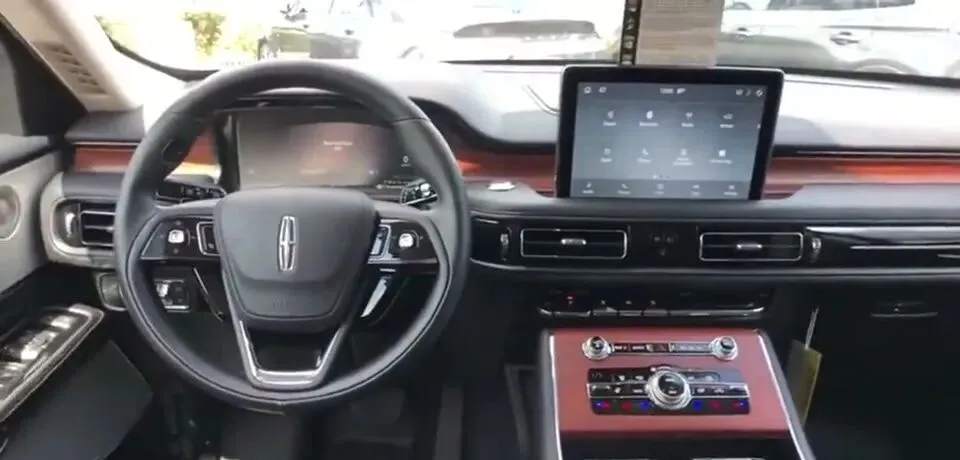 “展示林肯飞行家的驾驶舱,配备3.0T双涡轮V6增压发动机。”