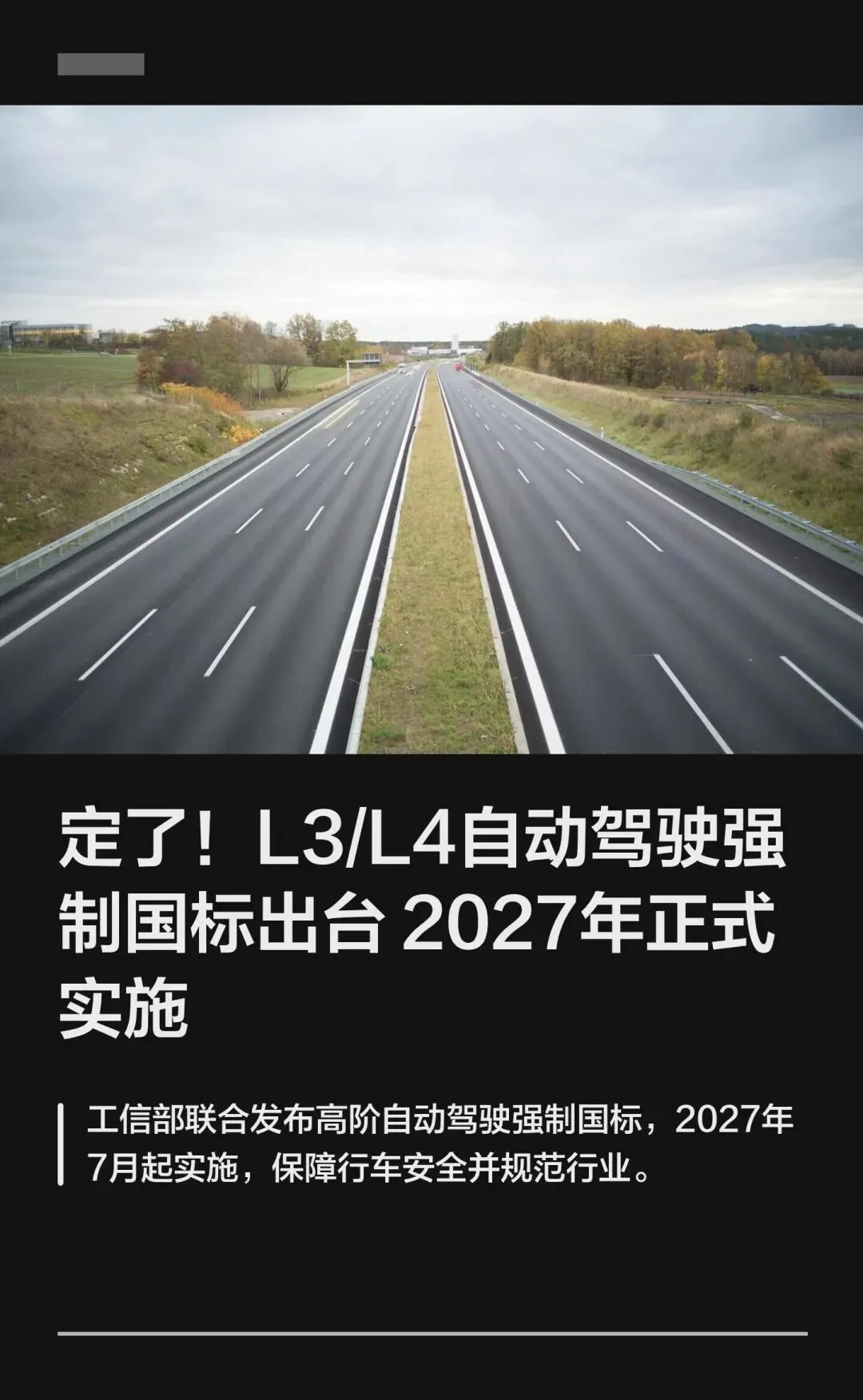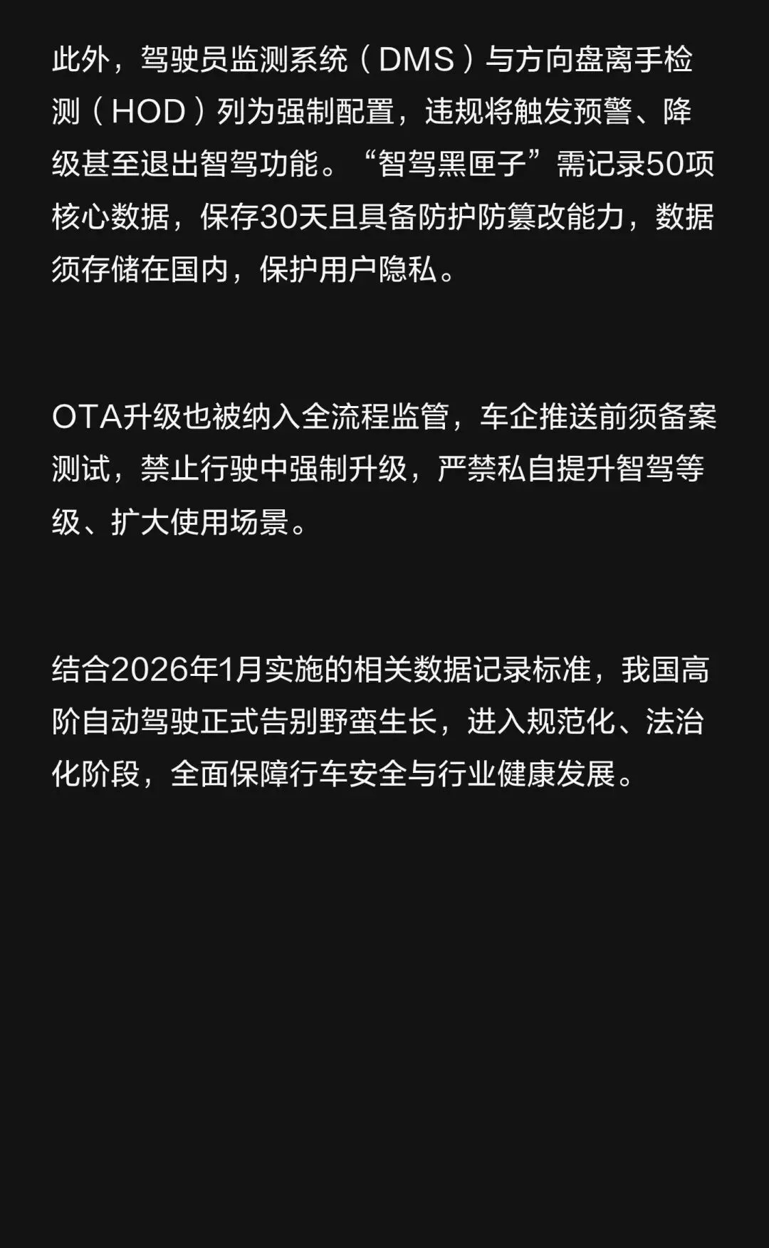 2027年7月1日实施,L3-L4自动驾驶需达标,车企须标注等级,DMS与HOD为标配,OTA升级需备案,保障行车安全。