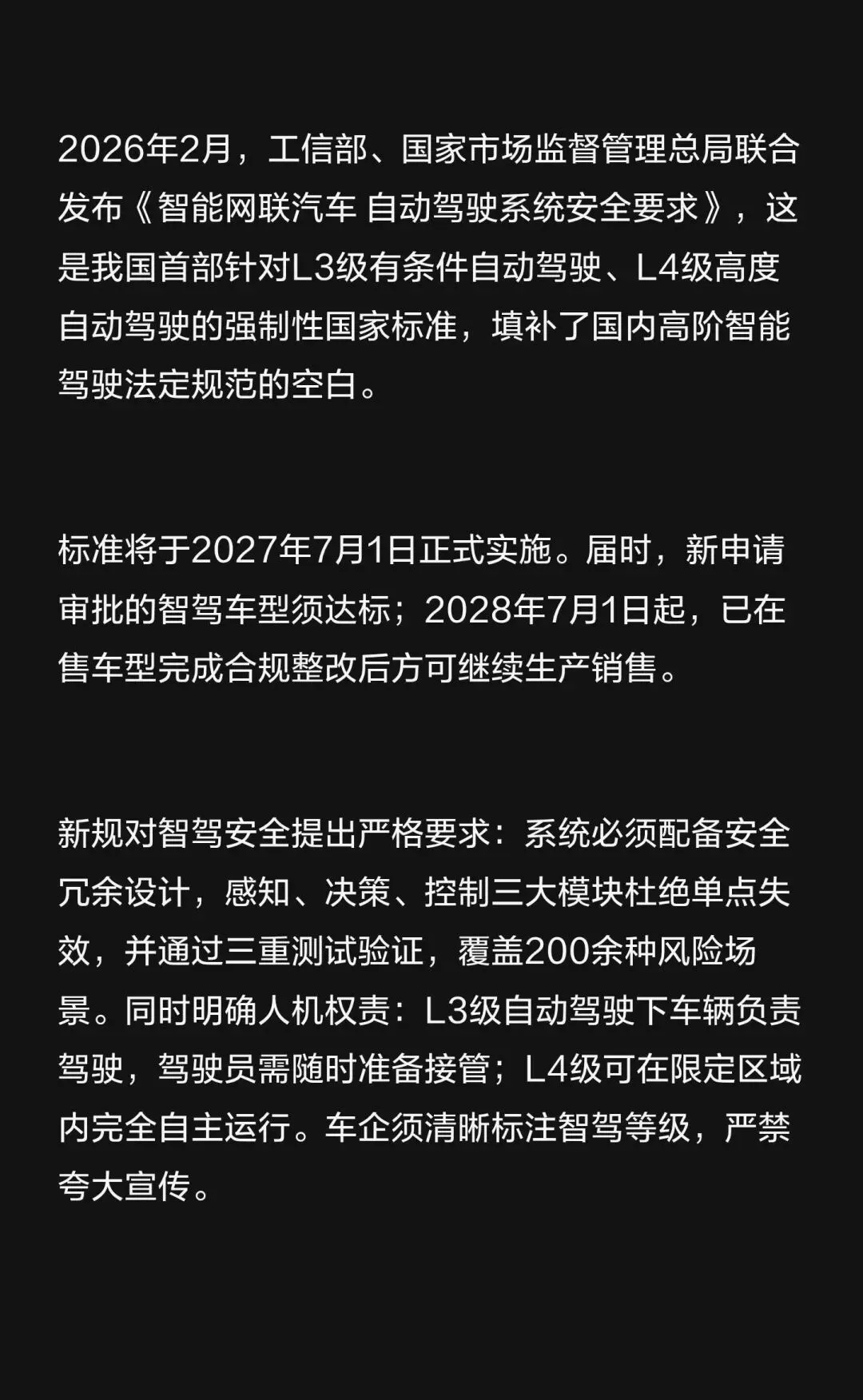 2026年2月,工信部、市场监管总局发布《智能网联汽车自动驾驶系统安全要求》。