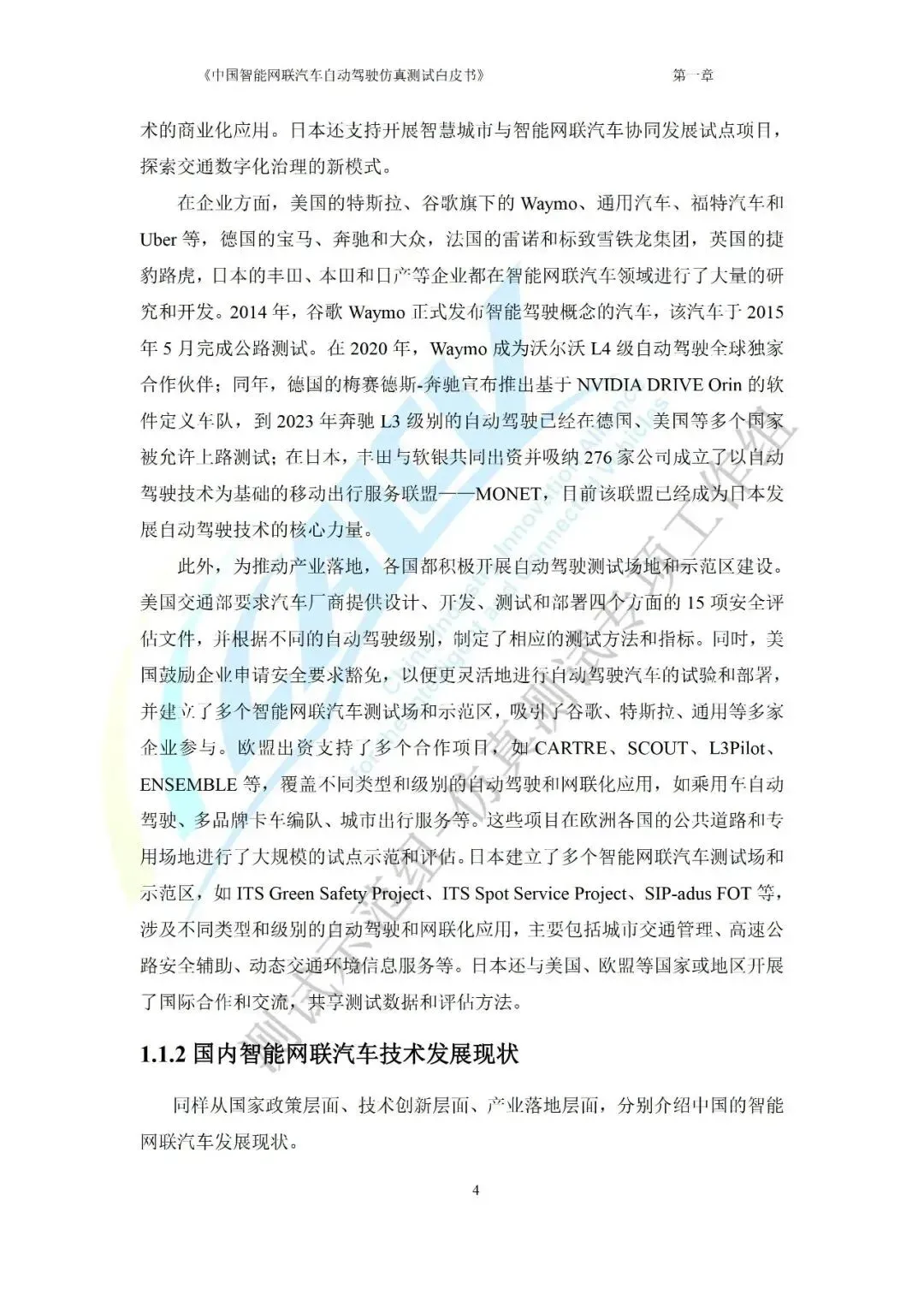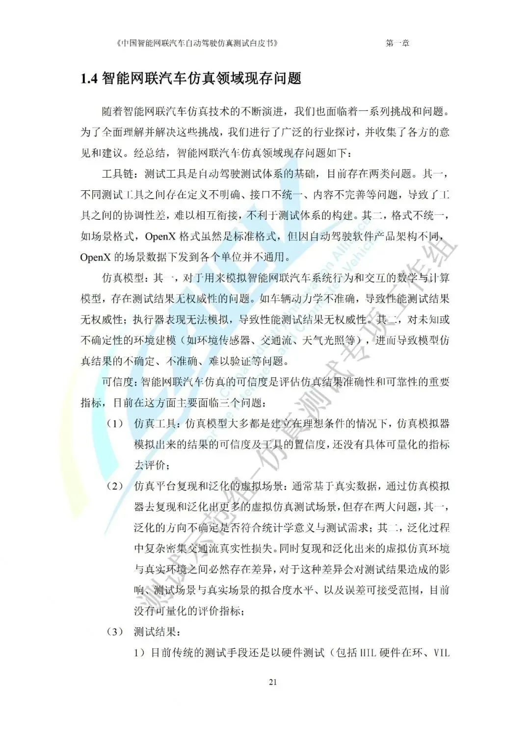 本白皮书旨在全面梳理智能网联汽车仿真测试领域的发展现状,通过深入剖析在环仿真测试技术、仿真测试场景库、仿真测试模型、仿真测试工具 以及仿真测试评价体系等关键领域的最新进展,为政府决策部门、行业研究机构、汽车厂商、技术供应商以及广大消费者提供一个了解智能网联汽车性能验证技术的清晰、全面视角,更好地理解和把握智能网联汽车测试技术的发展趋势和市场需求。