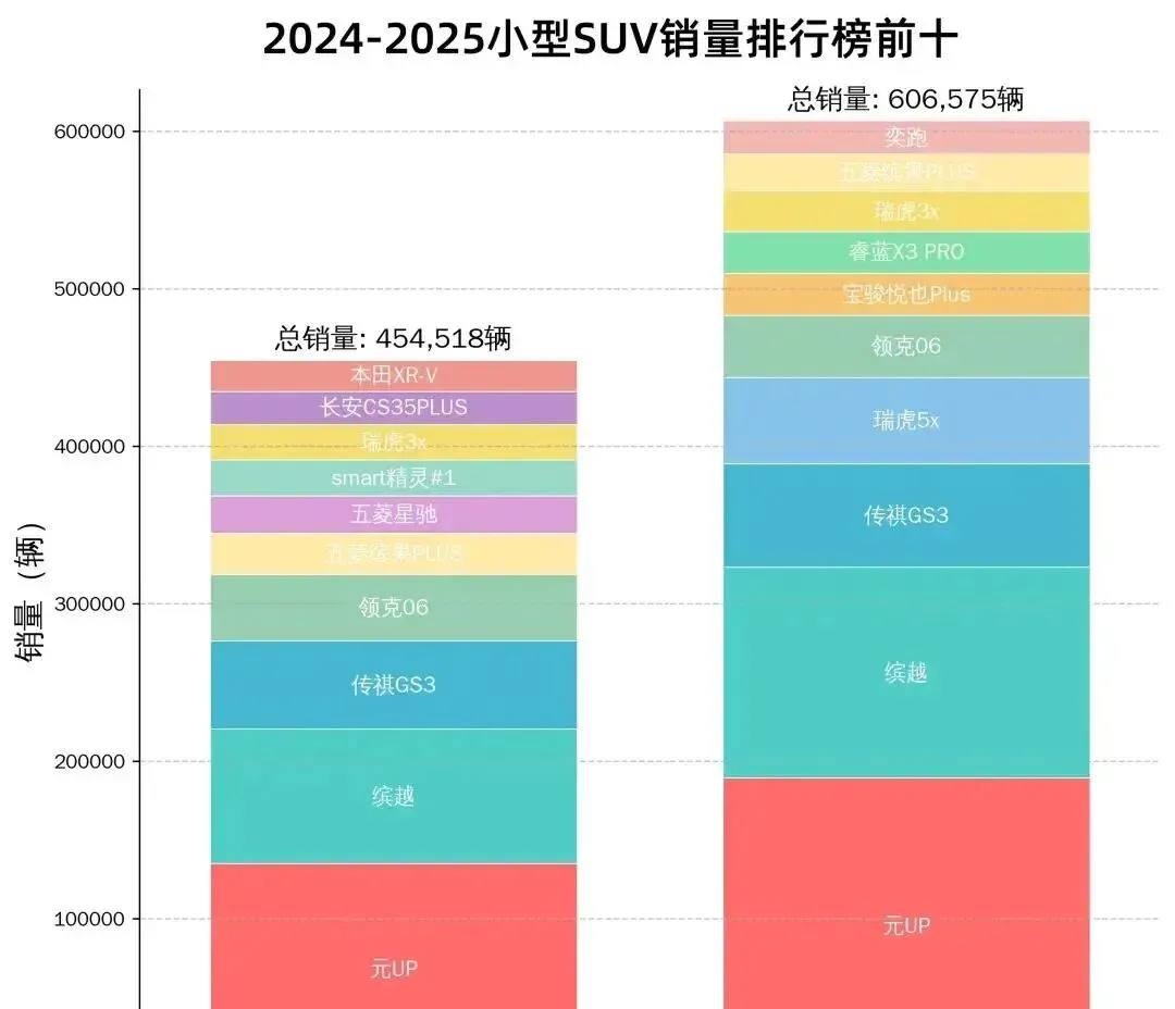 2025年小型SUV销量前十总和才60万辆——特斯拉Model Y去年刚卖45万!