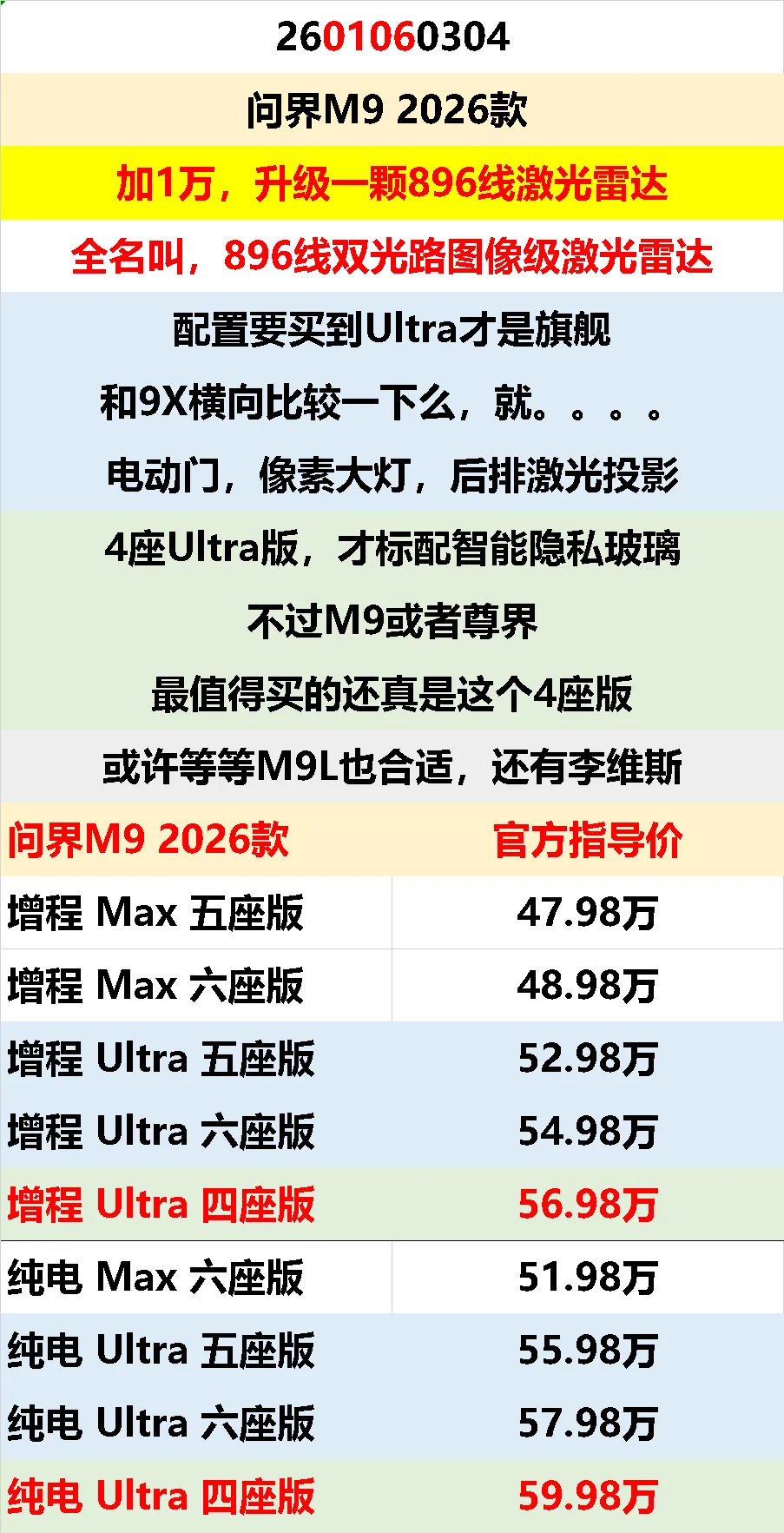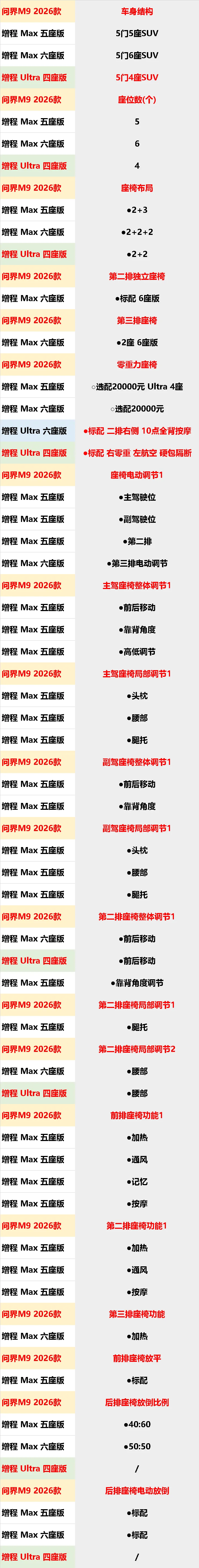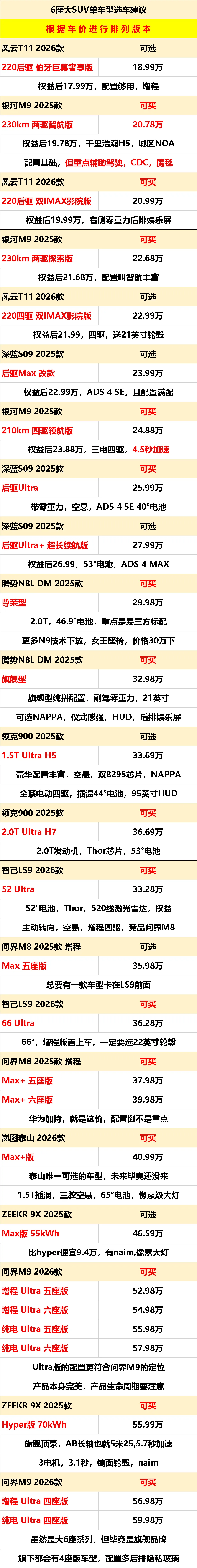 1.车型首选:4座版,问界M9,4座版更符合车型本身定位和问界品牌的实质目标定位。2.车型次选:Ultra版,竞品是极氪9X的Hyper,怎么说呢,毕竟M9上市已久,其实也可以再等等M9L或者理想L9李维斯。3.896线激光雷达,虽然只是一个配件,但代表着未来自动驾驶的确定性,今天已经搭配到车!4.大6座SUV,25年新上市的还有捷途纵横,25年魏牌的蓝山也有更新,26年大众途昂Pro也更新了26款,后续为大家再简单罗列一下。1.20万以下有三款可选,T11的伯牙巨幕18万以下,价格都接近奕派008和零跑C16了,毕竟是5米2的大6座SUV,银河的两驱智航重点在辅助驾驶,CDC和魔毯悬挂,T11的双IMAX重点在配置完善上。2.22万不到的价格,可以买到T11的四驱双IMAX和满配版的银河两驱探索版,我觉得这两款家用都超配了,前面20万售价不到的三款,才是高级性价比。3.23万就能买到,ADS 4 SE加持的满配版深蓝S09 MAX,不过没零重力座椅。4.23.88万就可以买到,三电四驱百公里加速4.5秒的银河M9顶配四驱领航版。5.25万,能买到带空悬的深蓝S09,这么多车型里首款开始配置空悬的车型,后置后驱,电池40度,还有后排双零重力座椅。且在这个基础上再加2万,就可以升级到53°电池和ADS MAX 。6.30.69万可以买到领克1.5T Ultra,33.69万可以买到领克2.0T Ultra,27.99万的领克1.5T Halo倒是衔接到27万这个价格段了,所以吧上下横向一比较,领克900定位可不是便宜的车。领克900里新出现的重要配置名词简单罗列一下,双腔空气悬挂,电动吸合门,NAPPA真皮座椅,后窗遮阳帘,麂皮绒顶棚。7.29.98万的重磅选手,腾势N8L出场,不过在这个9字当道的年代,名字带8好像气势就会差一点。29.98万的腾势N8L,易三方,2.0T发动机,46.9°电池,1300公里CLTC续航,和1.5T 领克900 Ultra版直接竞争,以我们选择插混的唯一标准发动机排量来说,那易三方的N8L就是完胜,不过从配置角度说吧,领克900还是领先的。8.智己LS9起售价32.28万,也就是正式开始30万以上售价的竞争了,当空悬,冷暖箱,三排电加热都只是标准配置的时候,开始进入主动转向,更大电池,矩阵大灯,就是一步步的更卷技术,更卷配置的维度了。但其实作为消费者,买到30万以上的车的时候,最最看重的就不一定是这些技术或者配置单方面的东西了,而是品牌这种深层次的,看不见且摸不着的内容了。不过其实,智己LS9单看账面内容,可能暂时还是比问界M8性价比稍高。9.问界M8增程,华为产品,就是这价,无关配置,无关竞品!10.岚图泰山唯一的小小的bug只是发动机用了1.5T,虽然我们相信,毕竟有65°大电池,更大的排量是没有意义的,但是毕竟在我们眼中,这就是一款40万以上的车,所以有2.0T的象征性意义会更合适。40.99的Max+标配HUAWEI XPIXEL 像素级智慧投影大灯,整车还是22英寸轮毂,全系赠送全车电动门,三腔空悬,只能说华为加持还是比华为产品要亲民一点,虽然已经到40万级别,但该省省,该花花啊。11.恭喜大家价格直接跳到55万了,没有什么可以多聊的,这只是极氪9X,真旗舰才更贵,只是一种真正价值的客观体现!当然48.59万的Ultra也是很好的选择,加个曜黑包就更帅。12.问界M9配置还是要从Ultra版开始选,鸿蒙智行的销量,本身就带有很强大的华为信念感!其实问界M9本身就是旗舰大6座SUV树立标杆的命定之车,但庆幸现在已有极氪9X,能与之势均力敌,且还是插混光环。品牌太多怎么选?车型更多看花眼!