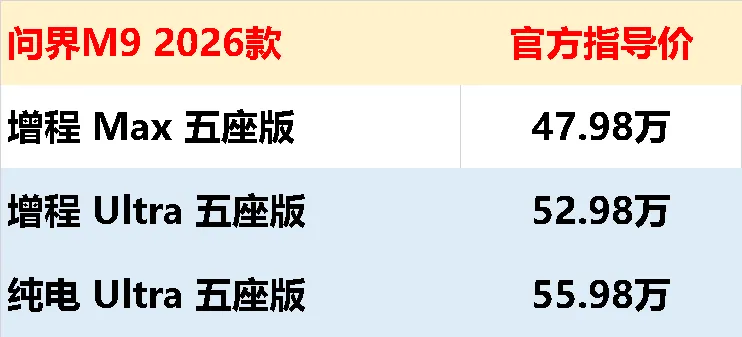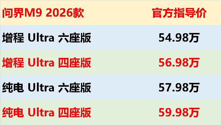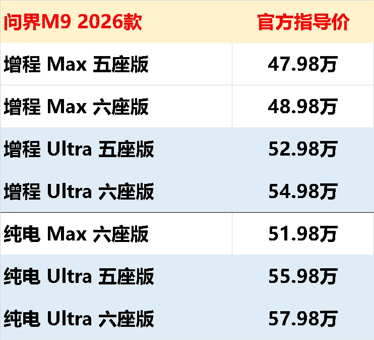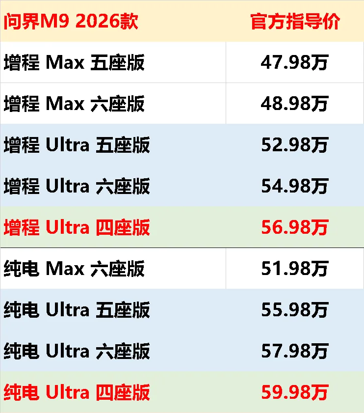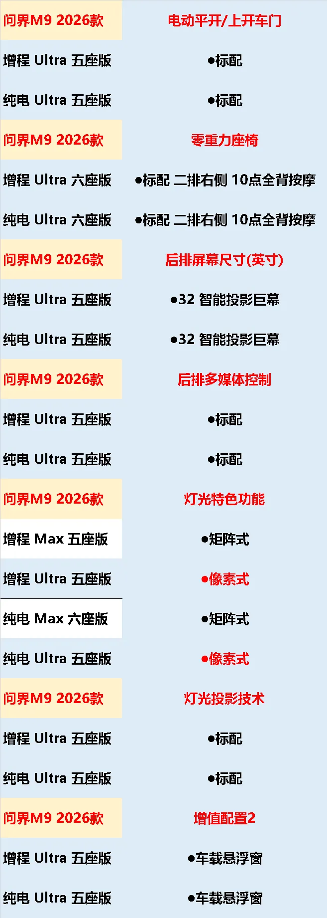 1.车型首选:4座版,问界M9,4座版更符合车型本身定位和问界品牌的实质目标定位。2.车型次选:Ultra版,竞品是极氪9X的Hyper,怎么说呢,毕竟M9上市已久,其实也可以再等等M9L或者理想L9李维斯。3.896线激光雷达,虽然只是一个配件,但代表着未来自动驾驶的确定性,今天已经搭配到车!4.大6座SUV,25年新上市的还有捷途纵横,25年魏牌的蓝山也有更新,26年大众途昂Pro也更新了26款,后续为大家再简单罗列一下。1.20万以下有三款可选,T11的伯牙巨幕18万以下,价格都接近奕派008和零跑C16了,毕竟是5米2的大6座SUV,银河的两驱智航重点在辅助驾驶,CDC和魔毯悬挂,T11的双IMAX重点在配置完善上。2.22万不到的价格,可以买到T11的四驱双IMAX和满配版的银河两驱探索版,我觉得这两款家用都超配了,前面20万售价不到的三款,才是高级性价比。3.23万就能买到,ADS 4 SE加持的满配版深蓝S09 MAX,不过没零重力座椅。4.23.88万就可以买到,三电四驱百公里加速4.5秒的银河M9顶配四驱领航版。5.25万,能买到带空悬的深蓝S09,这么多车型里首款开始配置空悬的车型,后置后驱,电池40度,还有后排双零重力座椅。且在这个基础上再加2万,就可以升级到53°电池和ADS MAX 。6.30.69万可以买到领克1.5T Ultra,33.69万可以买到领克2.0T Ultra,27.99万的领克1.5T Halo倒是衔接到27万这个价格段了,所以吧上下横向一比较,领克900定位可不是便宜的车。领克900里新出现的重要配置名词简单罗列一下,双腔空气悬挂,电动吸合门,NAPPA真皮座椅,后窗遮阳帘,麂皮绒顶棚。7.29.98万的重磅选手,腾势N8L出场,不过在这个9字当道的年代,名字带8好像气势就会差一点。29.98万的腾势N8L,易三方,2.0T发动机,46.9°电池,1300公里CLTC续航,和1.5T 领克900 Ultra版直接竞争,以我们选择插混的唯一标准发动机排量来说,那易三方的N8L就是完胜,不过从配置角度说吧,领克900还是领先的。8.智己LS9起售价32.28万,也就是正式开始30万以上售价的竞争了,当空悬,冷暖箱,三排电加热都只是标准配置的时候,开始进入主动转向,更大电池,矩阵大灯,就是一步步的更卷技术,更卷配置的维度了。但其实作为消费者,买到30万以上的车的时候,最最看重的就不一定是这些技术或者配置单方面的东西了,而是品牌这种深层次的,看不见且摸不着的内容了。不过其实,智己LS9单看账面内容,可能暂时还是比问界M8性价比稍高。9.问界M8增程,华为产品,就是这价,无关配置,无关竞品!10.岚图泰山唯一的小小的bug只是发动机用了1.5T,虽然我们相信,毕竟有65°大电池,更大的排量是没有意义的,但是毕竟在我们眼中,这就是一款40万以上的车,所以有2.0T的象征性意义会更合适。40.99的Max+标配HUAWEI XPIXEL 像素级智慧投影大灯,整车还是22英寸轮毂,全系赠送全车电动门,三腔空悬,只能说华为加持还是比华为产品要亲民一点,虽然已经到40万级别,但该省省,该花花啊。11.恭喜大家价格直接跳到55万了,没有什么可以多聊的,这只是极氪9X,真旗舰才更贵,只是一种真正价值的客观体现!当然48.59万的Ultra也是很好的选择,加个曜黑包就更帅。12.问界M9配置还是要从Ultra版开始选,鸿蒙智行的销量,本身就带有很强大的华为信念感!其实问界M9本身就是旗舰大6座SUV树立标杆的命定之车,但庆幸现在已有极氪9X,能与之势均力敌,且还是插混光环。品牌太多怎么选?车型更多看花眼!