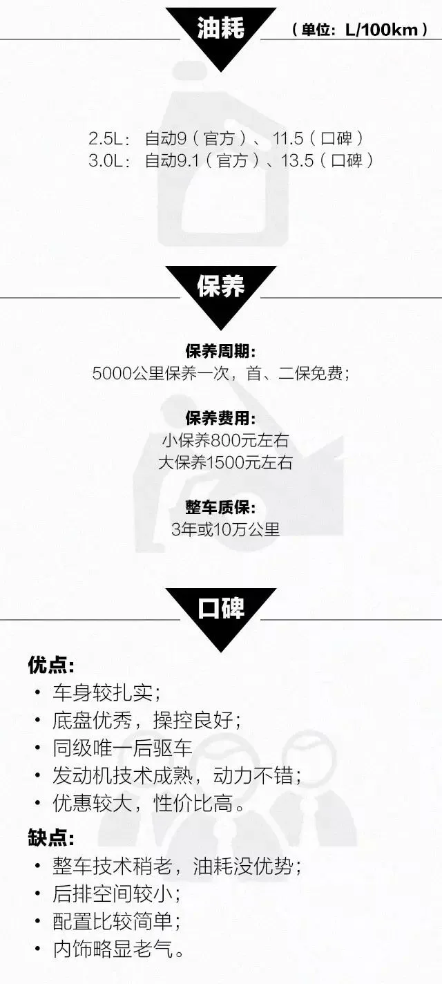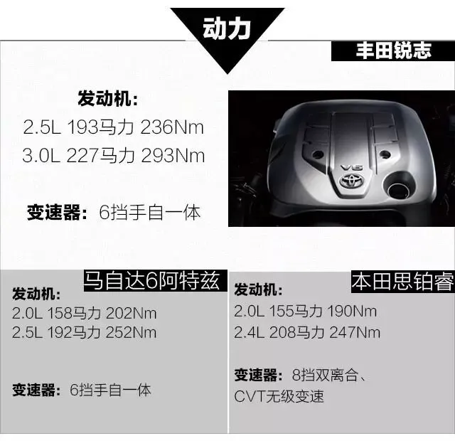 砖叔点评:锐志提供的是2.5L V6和3.0 V6两款发动机,匹配的是6挡手自一体变速箱,特别是3.0L V6自然吸气发动机带来平而顺的强劲动力,与竞争对手相比V6发动机的动力表现要有一定过人之处。