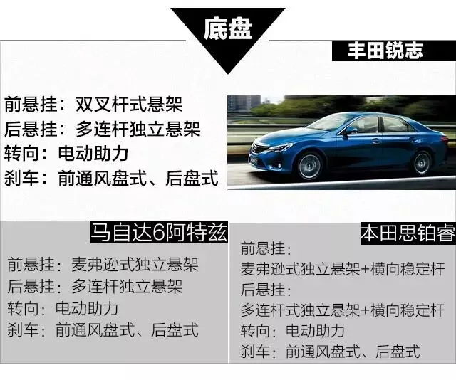 砖叔点评: 锐志底盘悬架前采用双连杆式悬架,后采用多连杆独立悬架,前置后驱的底盘是锐志的一个卖点,保证良好操控性的同时候也有一定稳定性。