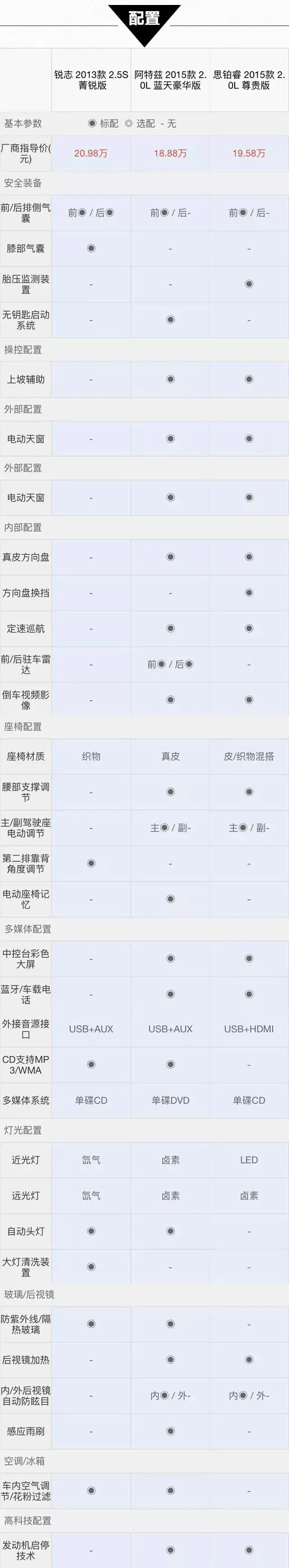 砖叔点评:作为一款运动型中级车,锐志的车身并不算突出,与对比车型比较也不占优势,但是2850mm的轴距上却略胜一筹。总体来说在空间上,锐志还是有些弱势。