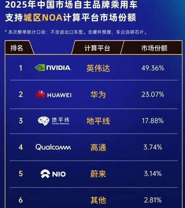 此外,在市场份额上,英伟达的份额,已经跌至50%以下了,如上图所示,可以看到国内支持NOA计算平台的汽车中,英伟达份额跌至50%以下,华为占以了23%,地平线占到了18%左右,国产明显强势崛起了。