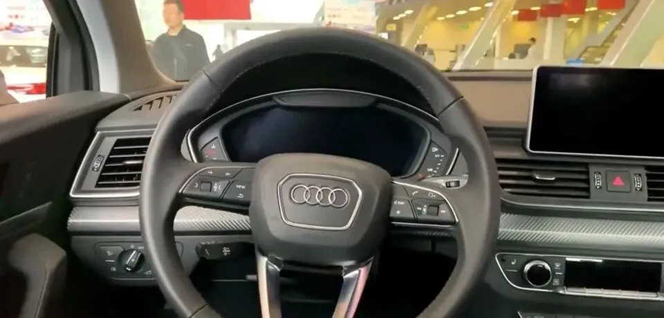 展示奥迪Q5L SUV的内饰设计,包括方向盘、中控台等。