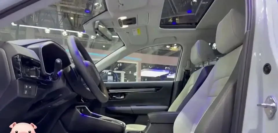 展示本田CRV的内部空间,包括座椅、方向盘和中控台的设计,以及全景天窗。