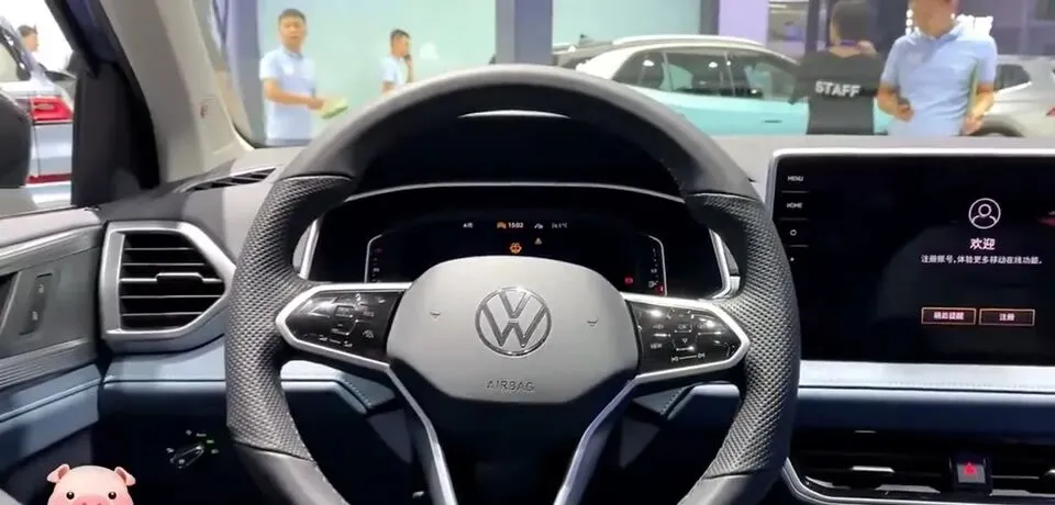 大众途岳SUV内饰展示,方向盘和中控屏幕等细节。