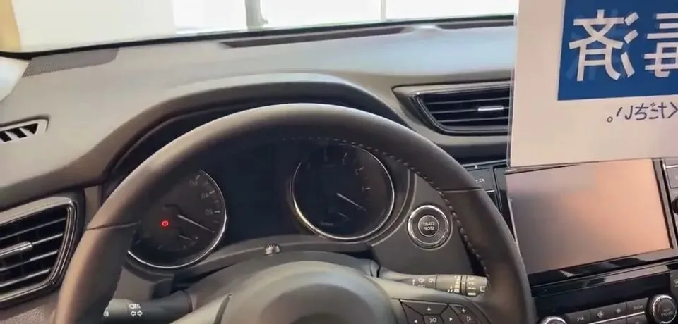 “展示日产奇骏汽车的驾驶舱,方向盘简洁大方。”