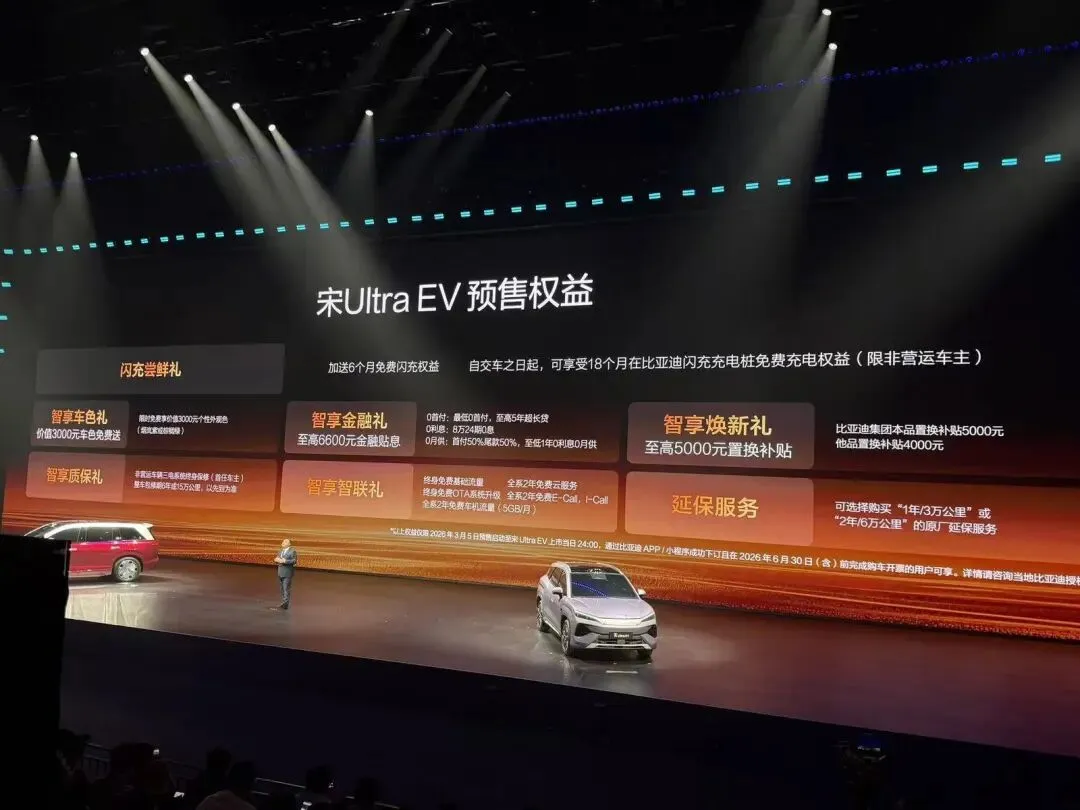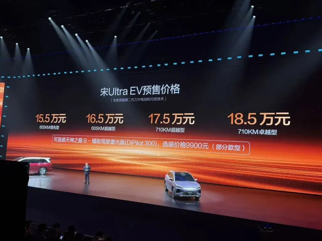 3月5日,比亚迪王朝首款 B 级纯电 SUV 宋 Ultra EV 车型今日正式发布,预售价 15.5 万元起,将在 3 月底上市。