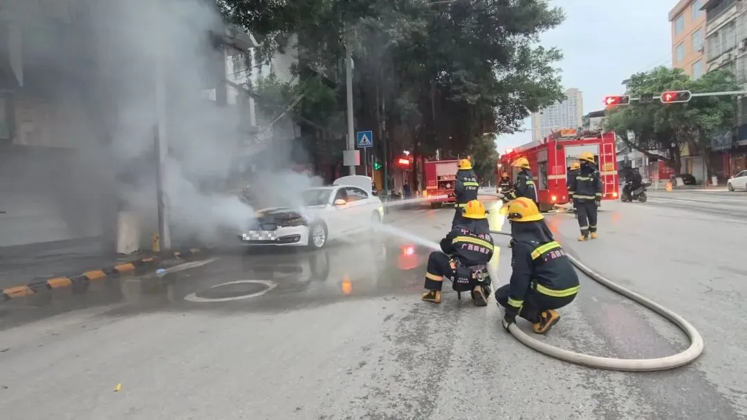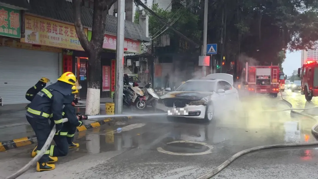 清晨街头突现火情!防城港消防快速处置 轿车起火无伤亡
