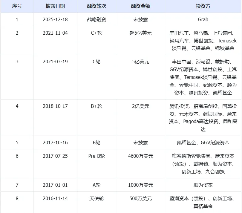 自2016年成立以来,Momenta融资节奏密集。早期获蓝湖资本、真格基金、创新工场等支持;2017-2018年引入腾讯、蔚来资本、梅赛德斯-奔驰等,估值突破10亿美元,成为独角兽。2021年是其融资高峰,C轮累计融资超10亿美元,吸引了上汽集团、丰田、通用汽车、博世、淡马锡、云锋基金等产业巨头领投。2025年底,公司再获东南亚超级应用Grab的战略投资,最新估值据称已超50亿美元。