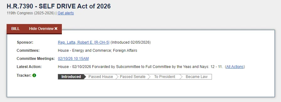 [1] Latta, R. E. SELF DRIVE Act of 2026,119th Congress (2025-2026) H.R.7390