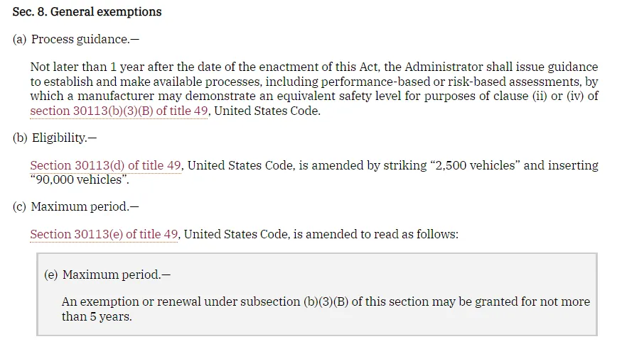 法案H.R.7389由众议院能源与商务委员会主席Brett Guthrie牵头提出,核心是解决原生自动驾驶车型的量产准入问题,也是最受产业界欢迎的条款。其核心内容是将无方向盘、无踏板等传统控制装置的自动驾驶车辆的年度量产豁免上限,从现行的2500辆提升至9万辆,单次豁免有效期也从2年延长至5年。这为真正面向未来的自动驾驶车型扫清了量产上市的最大法律障碍。[7]