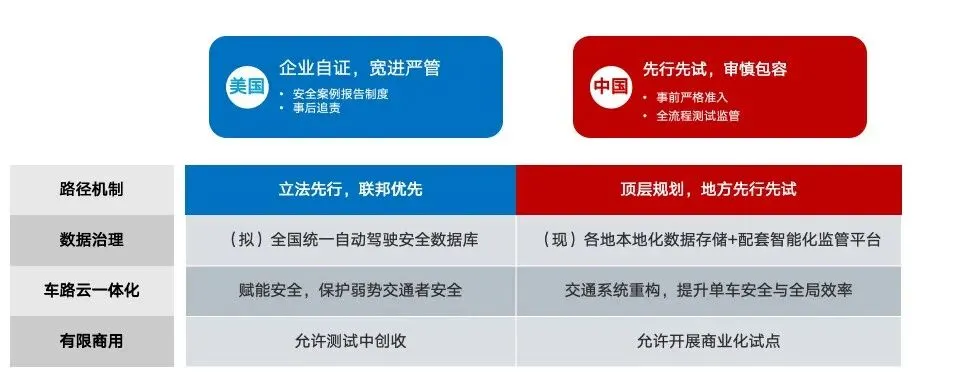 总体而言,美国模式遵循“企业自证、宽进严管”原则,以安全案例报告制度为核心,采取较为宽松的豁免制度,由企业自主定义运行范围并进行事后追责。中国模式则采取“小步快跑、审慎包容”的态度逐步推进产业落地,在强调事前严格防范的同时,明确了涵盖车辆获准上路、实时监测、事故处置等在内的监管全流程技术标准与管理规范。