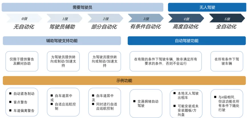 自动驾驶通常按照L1至L5进行分级,分别对应从辅助驾驶到完全自主驾驶的不同能力水平。其中L1到L3主要承担辅助支持角色,能够在特定条件下提供安全辅助、减轻驾驶负担,并提升操控便捷性与驾乘感受;而L4和L5则属于真正意义上的自动驾驶范畴,允许车辆在无人工干预的状态下完成行驶任务,从而重构出行方式并优化用户体验。