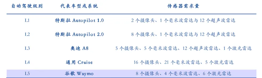 级别越高对摄像头、毫米波雷达与激光雷达的单车配套量越大