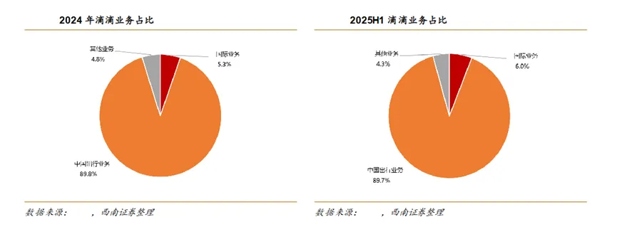 主营业务结构:从业务构成来看,滴滴主要分为三大板块:中国出行业务、国际业务,以及其他创新业务(涵盖自动驾驶、能源服务、货运等)。2025年上半年财报显示,公司总营收达1096.7亿元。其中,中国出行业务依然是核心支柱,实现营收983.5亿元,占比89.7%;国际业务营收65.6亿元,占比6.0%;包括Robotaxi、能源及两轮车在内的其他业务贡献营收47.5亿元,占比4.3%。