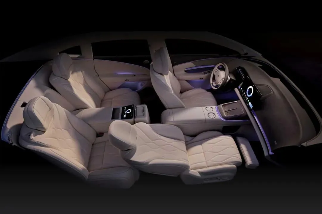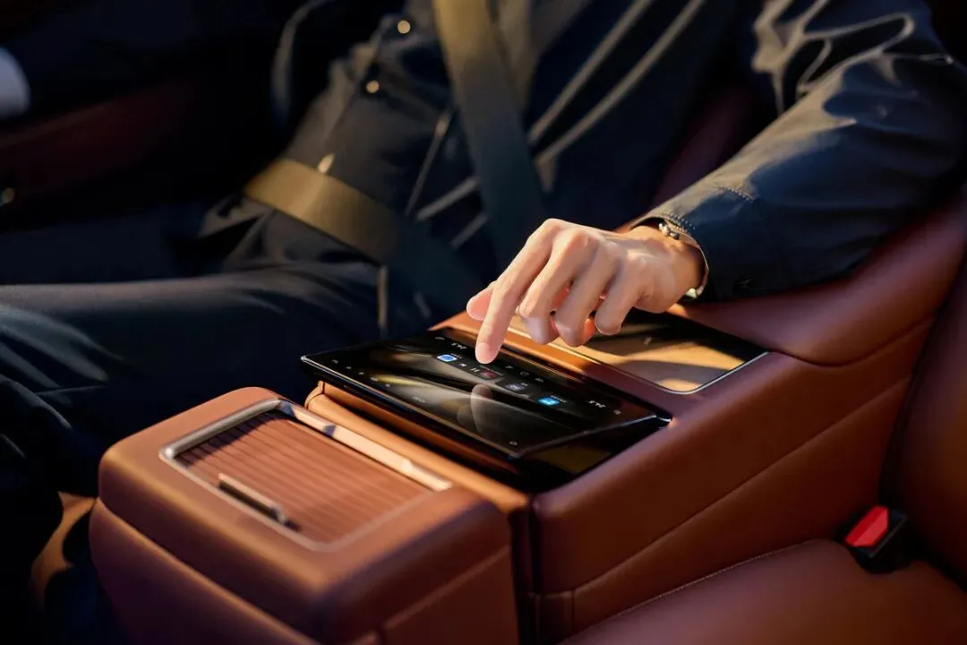 只需按下按钮,后排座椅靠背的中间部分就会降低,而座椅本身的中间部分则会升高。这样就形成了一个巨大的“平台”,上面配备了独立的7.9寸触摸屏、手机充电板和一个由帘子遮盖的储物格。昊铂将这种方案称为“2+1”,并且是入门级车型的可选配置。