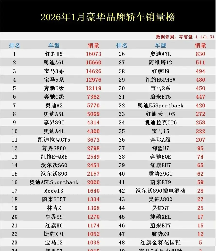 导读:近期,2026年1月豪华轿车零售量排行榜已正式出炉了!从整体榜单数据来看,传统BBA车型仍然是国内众多消费者的首选,在榜单前十名里面占据八款之多,其中奥迪A6L、宝马3系、奔驰E级等车型月销量均稳定在12119辆以上,而奔驰C级、奥迪A5L以及奥迪A4L等车型也都不甘示弱,继续在这一细分市场中持续放量。自主品牌则仅有两款车型排名靠前,虽然整体销量表现不及传统BBA,但部分车型也有亮眼的表现,比如红旗H5以16073辆的惊人销量力压所有传统BBA登顶榜单第一,享界S9T也在众多对手中脱颖而出拿下了榜单第九名的位置,另外、华为系尊界S800销量也都逐渐在豪华品牌轿车市场中站稳了脚跟,排名逆袭至第12名。别乱买!1月豪华轿车销量排名:奥迪A6L丢冠,C级第6,Model3第17