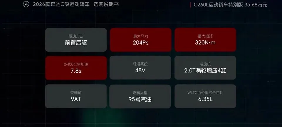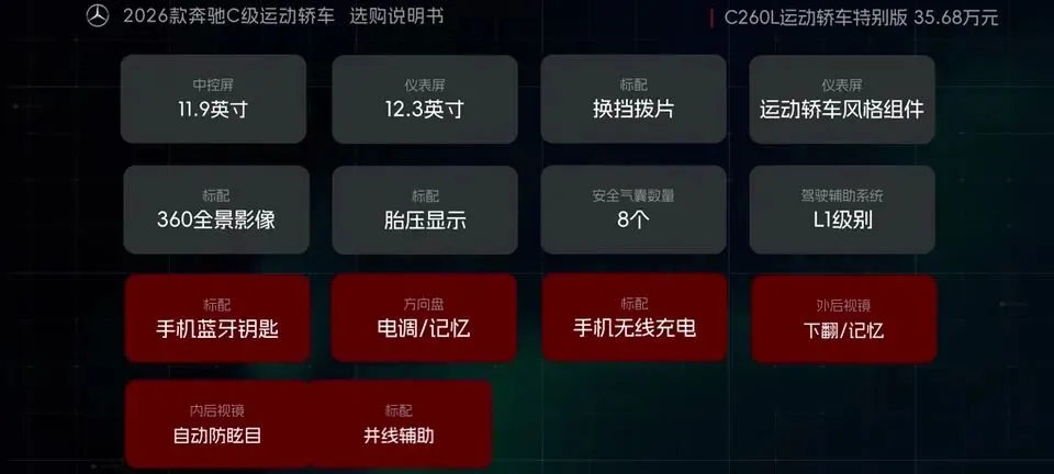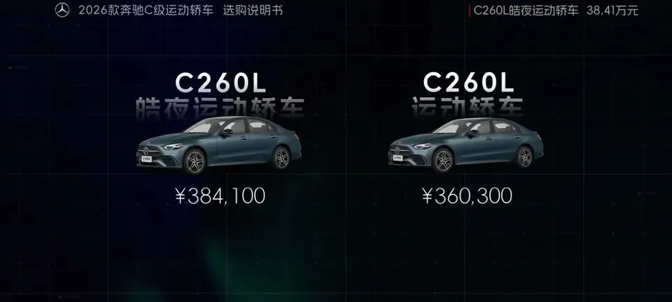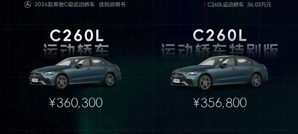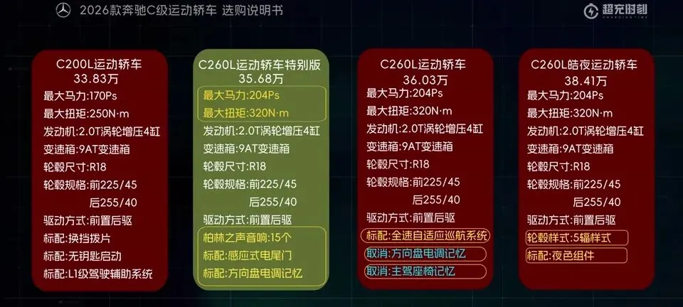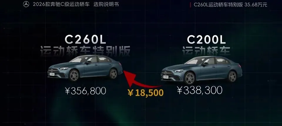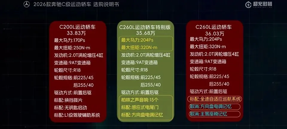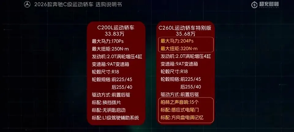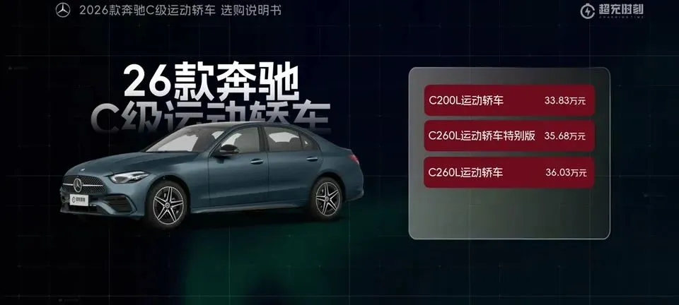 先把我的观点放这儿:26款奔驰C级运动轿车,四个版本里“最值得买”的就一个——C260L运动轿车特别版。至于另外两个:一个“能买但别幻想配置”,另一个“纯为颜值买单”,还有一个我个人觉得完全没必要选。26款奔驰C级运动轿车一共有4个版本: C200L运动轿车,33.83万元。C260L运动轿车特别版,35.68万元。C260L运动轿车,36.03万元。C260L皓夜运动轿车,38.41万元。另外还有个C260L轿车(立标),配置跟C260L运动轿车一样,只是外观内饰风格不同。个人感觉C级还是大标更合适一些,所以就不专门介绍了。车身6种颜色可选,这5种价格是包含的,熔岩红需要加6千2。内饰材质和配色也给得挺多,ARTICO皮革、Nappa真皮都有,具体大家看表就行。至于选装——我可以明确地跟大家说:“奔驰果然是不坑穷人啊,选装都挺贵的,虽然项目多,但其实你大部分都选不了,因为油车的逻辑是卖现车,而不是卖定制车,所以有多少心酸只有奔驰车主自己知道。”C200L运动轿车,33.83万,前置后驱,170Ps/250N·m,9.2秒,2.0T四缸+48V轻混,9AT,加95号,WLTC 6.35L/100km。功能配置:前双叉臂后五连杆、18英寸轮毂(前225/45后255/40)、可变转向比、运动风格组件、拨片、12.3仪表+11.9中控、360影像、8气囊、L1驾驶辅助。舒适配置:无钥匙启动、单天窗、真皮方向盘、仿皮座椅、前排加热、5喇叭、64色氛围灯、老板键、空气净化器等。我很负责任地说:“作为最低配,那配置就不用多说了,以这个价位来说算是比较低了,预算有限的话,可以选择这个版本。”但这句也要记牢:“记得在4s店提车的时候,就把标换成260再出门啊。”C260L运动轿车特别版,35.68万,比C200L贵1.85万。动力直接上强度:204Ps/320N·m,7.8秒。这提升属于你日常一脚油门就能感觉到的那种。功能性配置加了:手机蓝牙钥匙、方向盘电调/记忆、无线充电、外后视镜下翻记忆、自动防眩目内后视镜、并线辅助、内置行车记录仪等。舒适性更关键:5喇叭升级15喇叭柏林之声、无钥匙进入、分段式可开启全景天窗、前排通风、主驾记忆、迎宾灯、豪华环境氛围灯、感应电尾门。所以我个人很明确:“这个版本把动力、配置、柏林之声的音响都给了,可以说是官方主推的版本,综合来看也是性价比最高的版本,最值得推荐。”C260L运动轿车,36.03万,比特别版贵3500。它的逻辑很“奔驰”:加了全速自适应巡航,但砍掉方向盘电调记忆、外后视镜下翻记忆;舒适性上又砍掉前排座椅通风、主驾座椅记忆。我的态度很简单:“这个版本砍掉了太多的舒适性配置,换了一套没那么好用的智驾系统,总之你想在奔驰这儿占便宜那是真的难,完全没必要选这个版本啊。”再看C260L皓夜运动轿车,38.41万,比C260L贵2.38万。动力不变,主要变化就俩:轮毂换5幅样式+夜色组件。一句话总结:“主要就是多了一套AMG的外观套件和轮毂,完全没有性价比,只适合预算充足的大佬。”最后的最后补一句行业视角:奔驰C在友商围追堵截下,终于于是换装2.0T的发动机了。“虽然马力跟老款差不多,但低扭表现要更好”;但我也同意这句吐槽:“如果能再把这个时不时就出问题的48V轻混系统给去掉,这销量应该还能再往上走一走。”- 预算卡得紧:C200L(能开,但别挑)。
