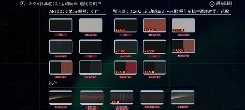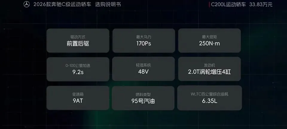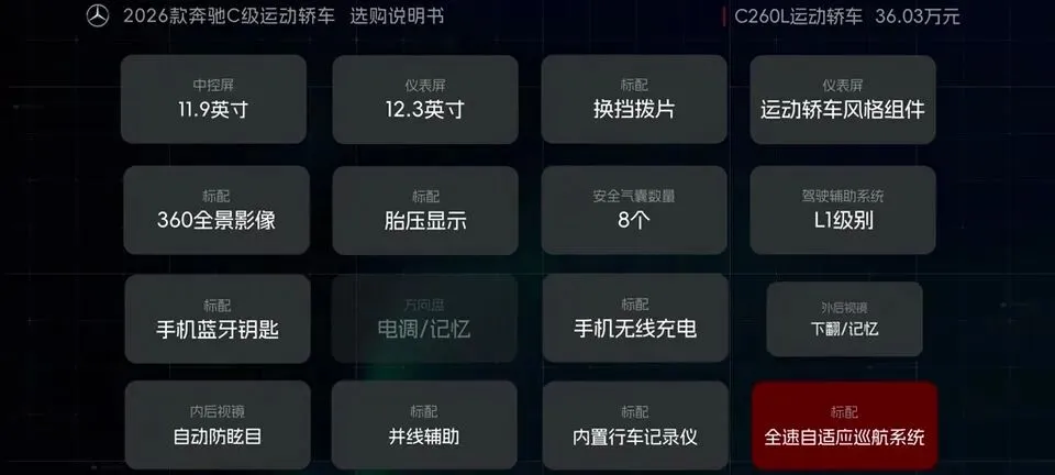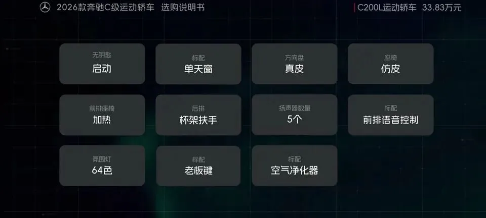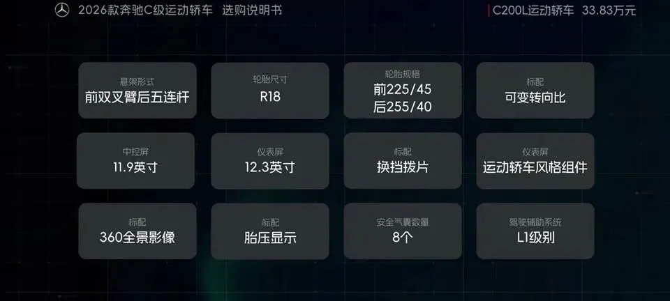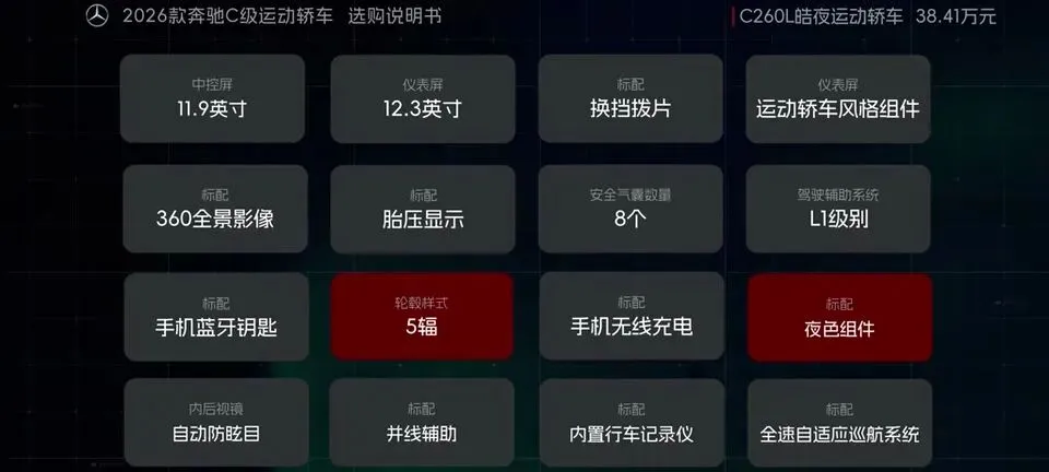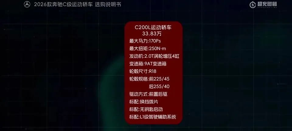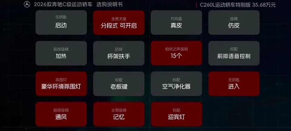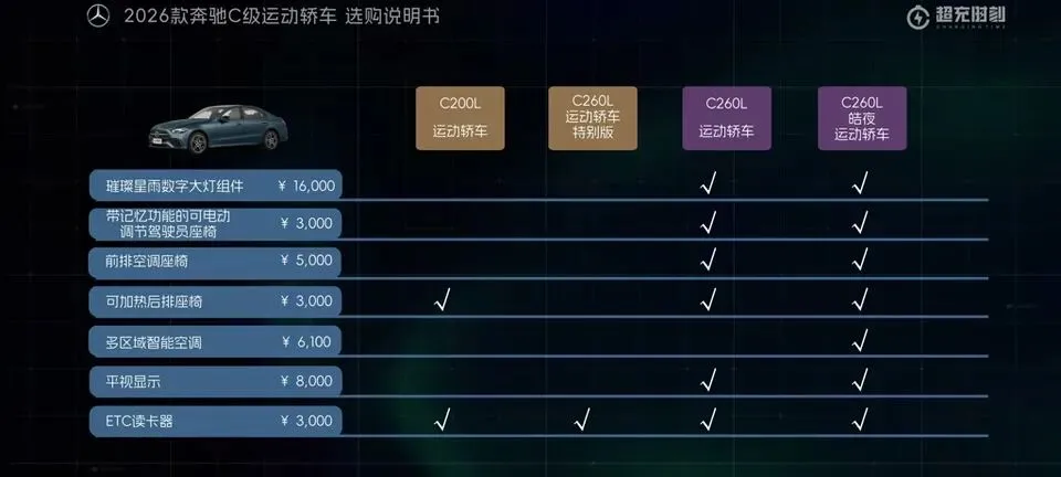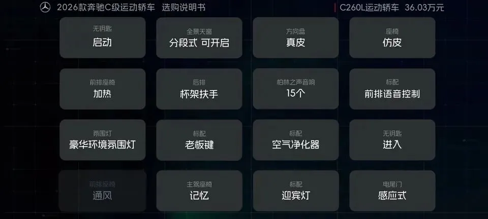 先把我的观点放这儿:26款奔驰C级运动轿车,四个版本里“最值得买”的就一个——C260L运动轿车特别版。至于另外两个:一个“能买但别幻想配置”,另一个“纯为颜值买单”,还有一个我个人觉得完全没必要选。26款奔驰C级运动轿车一共有4个版本: C200L运动轿车,33.83万元。C260L运动轿车特别版,35.68万元。C260L运动轿车,36.03万元。C260L皓夜运动轿车,38.41万元。另外还有个C260L轿车(立标),配置跟C260L运动轿车一样,只是外观内饰风格不同。个人感觉C级还是大标更合适一些,所以就不专门介绍了。车身6种颜色可选,这5种价格是包含的,熔岩红需要加6千2。内饰材质和配色也给得挺多,ARTICO皮革、Nappa真皮都有,具体大家看表就行。至于选装——我可以明确地跟大家说:“奔驰果然是不坑穷人啊,选装都挺贵的,虽然项目多,但其实你大部分都选不了,因为油车的逻辑是卖现车,而不是卖定制车,所以有多少心酸只有奔驰车主自己知道。”C200L运动轿车,33.83万,前置后驱,170Ps/250N·m,9.2秒,2.0T四缸+48V轻混,9AT,加95号,WLTC 6.35L/100km。功能配置:前双叉臂后五连杆、18英寸轮毂(前225/45后255/40)、可变转向比、运动风格组件、拨片、12.3仪表+11.9中控、360影像、8气囊、L1驾驶辅助。舒适配置:无钥匙启动、单天窗、真皮方向盘、仿皮座椅、前排加热、5喇叭、64色氛围灯、老板键、空气净化器等。我很负责任地说:“作为最低配,那配置就不用多说了,以这个价位来说算是比较低了,预算有限的话,可以选择这个版本。”但这句也要记牢:“记得在4s店提车的时候,就把标换成260再出门啊。”C260L运动轿车特别版,35.68万,比C200L贵1.85万。动力直接上强度:204Ps/320N·m,7.8秒。这提升属于你日常一脚油门就能感觉到的那种。功能性配置加了:手机蓝牙钥匙、方向盘电调/记忆、无线充电、外后视镜下翻记忆、自动防眩目内后视镜、并线辅助、内置行车记录仪等。舒适性更关键:5喇叭升级15喇叭柏林之声、无钥匙进入、分段式可开启全景天窗、前排通风、主驾记忆、迎宾灯、豪华环境氛围灯、感应电尾门。所以我个人很明确:“这个版本把动力、配置、柏林之声的音响都给了,可以说是官方主推的版本,综合来看也是性价比最高的版本,最值得推荐。”C260L运动轿车,36.03万,比特别版贵3500。它的逻辑很“奔驰”:加了全速自适应巡航,但砍掉方向盘电调记忆、外后视镜下翻记忆;舒适性上又砍掉前排座椅通风、主驾座椅记忆。我的态度很简单:“这个版本砍掉了太多的舒适性配置,换了一套没那么好用的智驾系统,总之你想在奔驰这儿占便宜那是真的难,完全没必要选这个版本啊。”再看C260L皓夜运动轿车,38.41万,比C260L贵2.38万。动力不变,主要变化就俩:轮毂换5幅样式+夜色组件。一句话总结:“主要就是多了一套AMG的外观套件和轮毂,完全没有性价比,只适合预算充足的大佬。”最后的最后补一句行业视角:奔驰C在友商围追堵截下,终于于是换装2.0T的发动机了。“虽然马力跟老款差不多,但低扭表现要更好”;但我也同意这句吐槽:“如果能再把这个时不时就出问题的48V轻混系统给去掉,这销量应该还能再往上走一走。”- 预算卡得紧:C200L(能开,但别挑)。