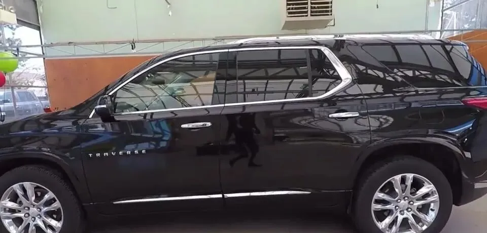“展示雪佛兰TRAVERSE的外观,黑色车身,空间比丰田汉兰达大,动力也比它强。”