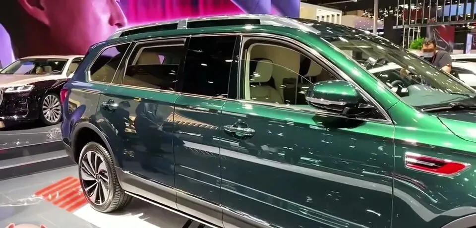 “展示红旗HS7的外观,绿色车身,外观是红旗的家族式设计风格,直瀑式大尺寸中网设计。”