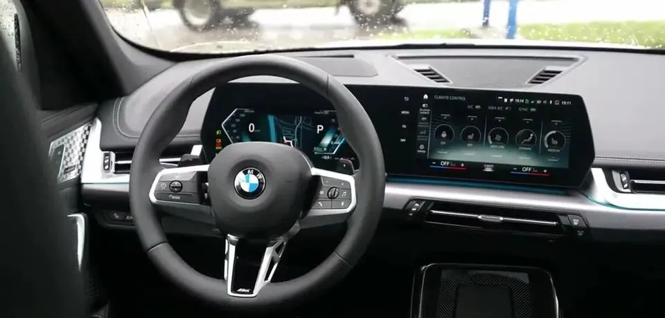 展示宝马X1的内饰,包括方向盘、中控屏幕和座椅等细节,突出其豪华感和科技感。