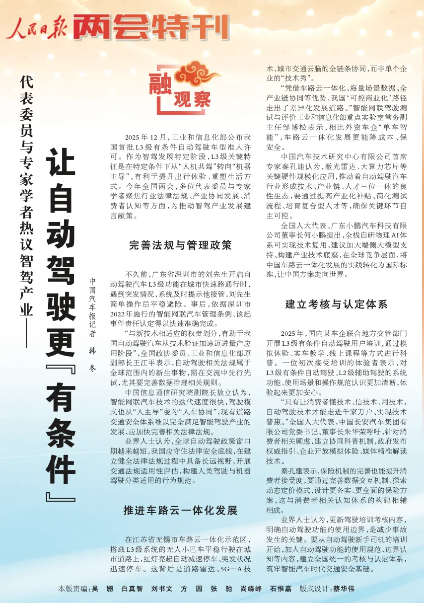 2025年12月,工业和信息化部公布我国首批L3级有条件自动驾驶车型准入许可。作为智驾发展特定阶段,L3级关键特征是在特定条件下从“人机共驾”转向“机器主导”,有利于提升出行体验、重塑生活方式。今年全国两会,多位代表委员与专家学者聚焦行业法律法规、产业协同发展、消费者认知等方面,为推动智驾产业发展建言献策。