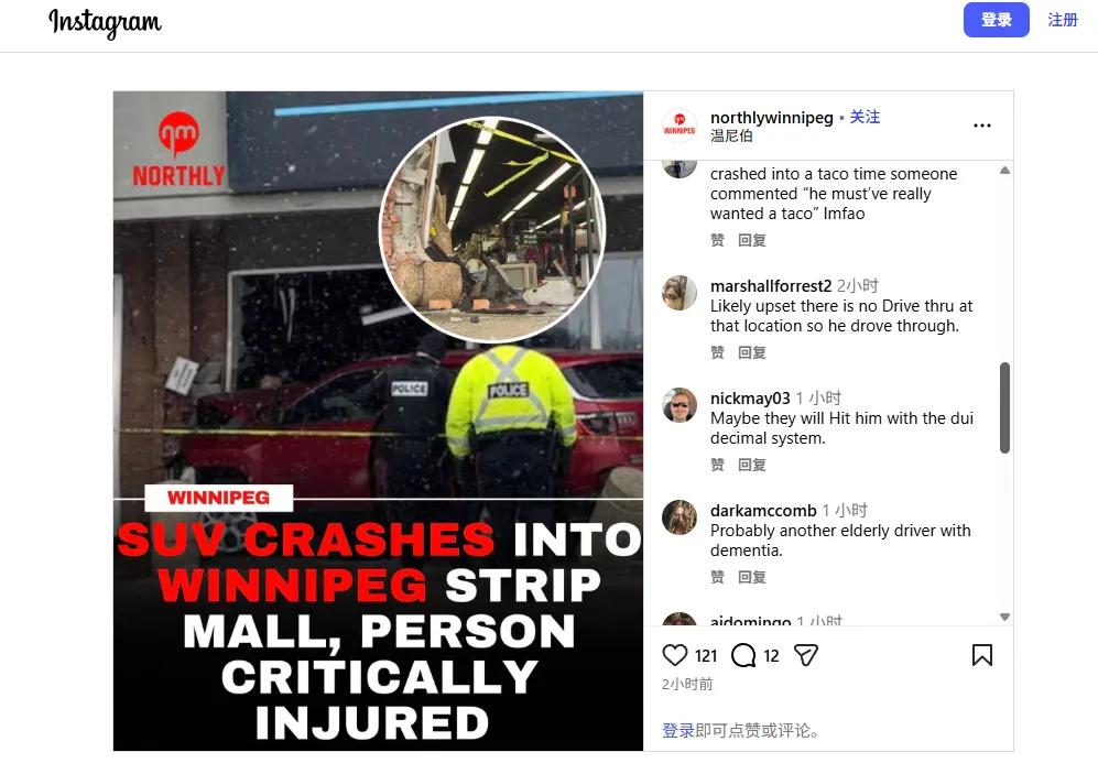 周四上午,一辆 SUV 撞入温尼伯一家购物中心,造成一人重伤。