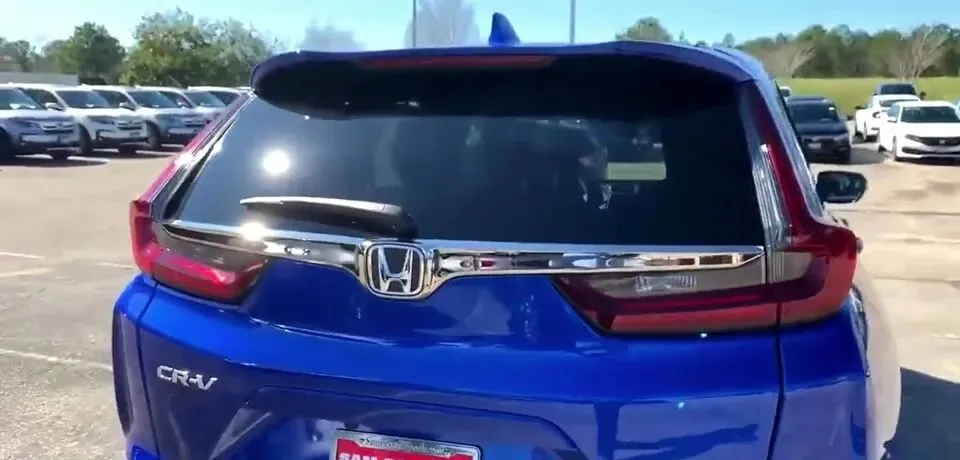 画面里展示了蓝色CRV的后方外观,包括尾灯、车标和CRV标志。