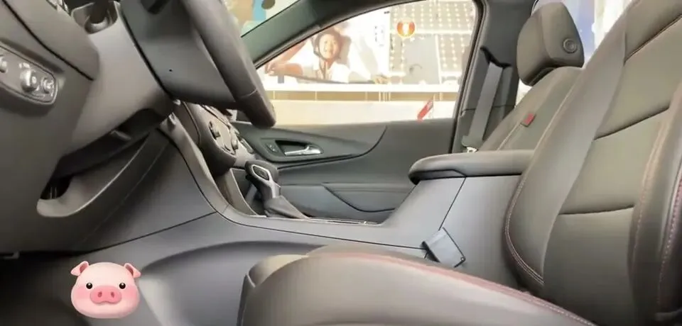 展示雪佛兰探界者的车内空间,内饰是灰色座椅,有红色缝线。