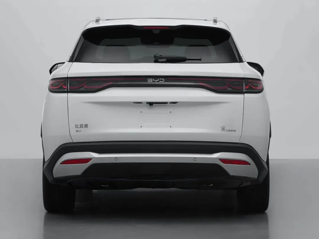 车身尾部,顶部配备高扰流板,尾灯为贯穿式尾灯组设计,在尾灯周围更是用熏黑加以处理,BYD标识中间,左尾灯下方为比亚迪EV标识,右尾灯下方为宋Ultra标识,后包围使用银色护板+黑色饰板进行装饰。