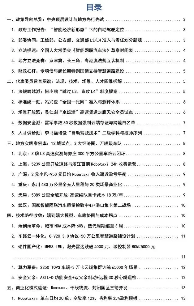 2026年全国及地方两会期间,自动驾驶作为新质生产力的典型代表和人工智能与实体经济深度融合的核心场景,成为政策关注和产业建言的焦点议题。笔者阅读了很多新闻报道和各类解读文章,并使用AI工具对2026年全国与地方两会期间自动驾驶相关政策文件、政府工作报告、代表委员建议及地方实践进行了系统性梳理,深度分析自动驾驶领域的政策导向、代表建言、地方实践及产业发展趋势。以下报告内容均来自于公开信息整理,由AI生成,或有偏差,仅供参考,不构成任何建议。一、政策导向总览:中央顶层设计与地方先行先试