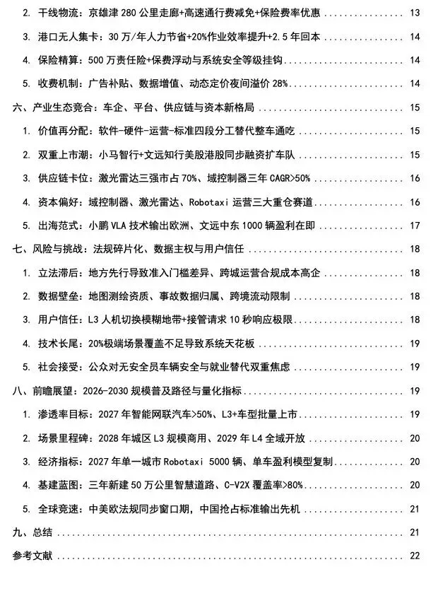 产业生态正在经历深刻重构,“软件-硬件-运营-标准”四段价值分工替代了传统整车厂一家通吃的模式,小马智行、文远知行的双重上市潮和小鹏VLA技术输出欧洲标志着中国企业的全球竞争力。尽管仍面临法规碎片化、数据壁垒、用户信任等挑战,但2026-2030年的规模普及路径已经清晰:2027年智能网联汽车渗透率超50%、2028年城区L3规模商用、2029年L4全域开放的目标,配合三年新建50万公里智慧道路的基建蓝图,将推动中国在全球自动驾驶竞争中占据领先地位。