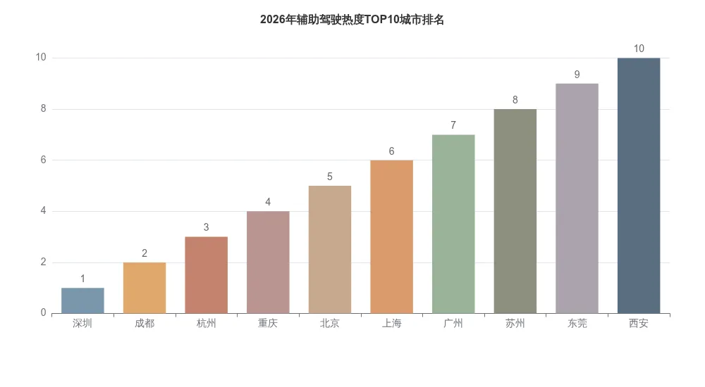 图表显示了2026年辅助驾驶热度TOP10城市排名,反映了智能驾驶技术落地的区域集中效应[51]。这些城市不仅是新能源汽车渗透率高的区域,也是智能驾驶技术落地的“主战场”—用户基数大、接受度高,自然贡献了最多的辅助驾驶里程。