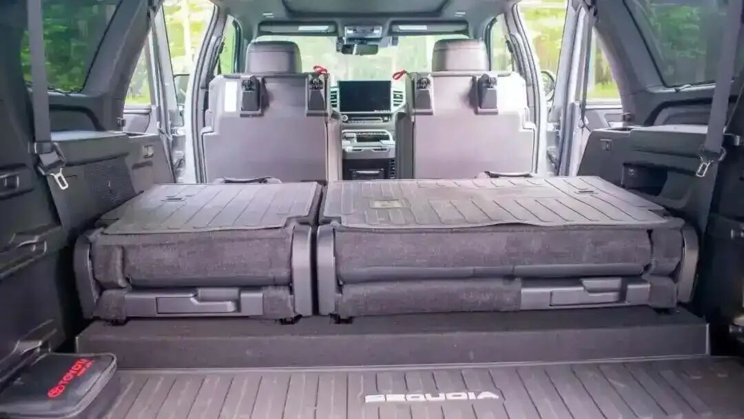 空间方面,新款丰田红杉 TRD Pro5210mm 的车长搭配 3099mm 的轴距,采用 2+3+2 的七座布局,前排座椅支持多向电动调节,带加热与通风功能,长途驾驶不易疲劳,第二排空间宽敞,180cm 的成年人乘坐也能保证充足的腿部空间,第三排可满足应急乘坐需求,日常长途穿越自驾、全家长途出行都能轻松适配。车内后备箱常规容积达到 526L,放倒第三排座椅后容积可拓展至 1899L,越野装备、露营物资都能轻松放下,实用性拉满。