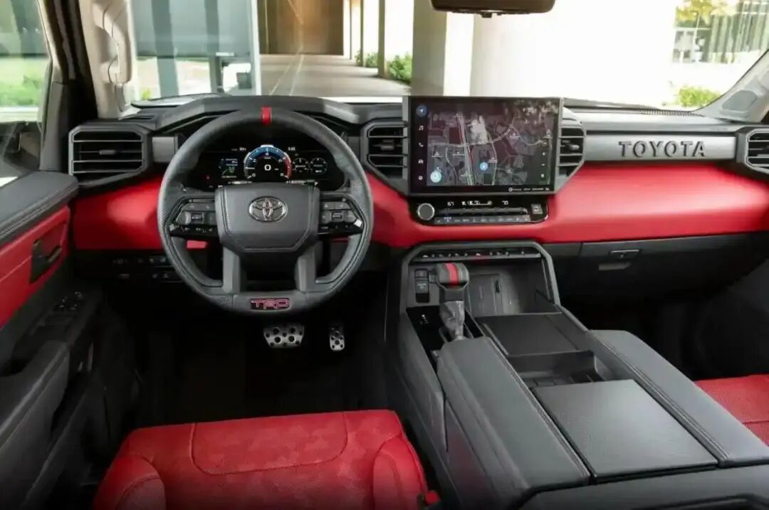 内饰与配置方面,新款丰田红杉 TRD Pro 采用了硬派实用的内饰设计,车内大面积采用软质材质包裹,搭配越野风格的装饰点缀,质感出众,14 英寸中控屏显示清晰,车机系统支持 CarPlay 互联与智能语音控制,标配 L2 级辅助驾驶系统、10 个安全气囊,座椅加热通风、自动空调、360 度全景影像等配置一应俱全,能兼顾越野与家用的双重需求。不过车机系统智能化表现一般,流畅度不如同价位城市 SUV,算是一个明显的短板。