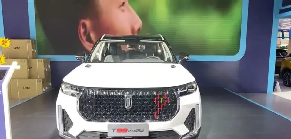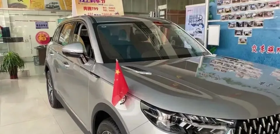 展示奔腾T99的外观设计,白色车身,前脸采用网状格栅设计,整体造型时尚。