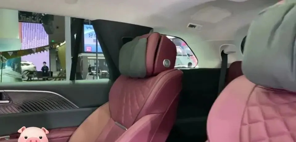 展示奔腾E-HS9的后排座椅,采用红色皮革包裹,座椅宽大舒适,空间宽敞。