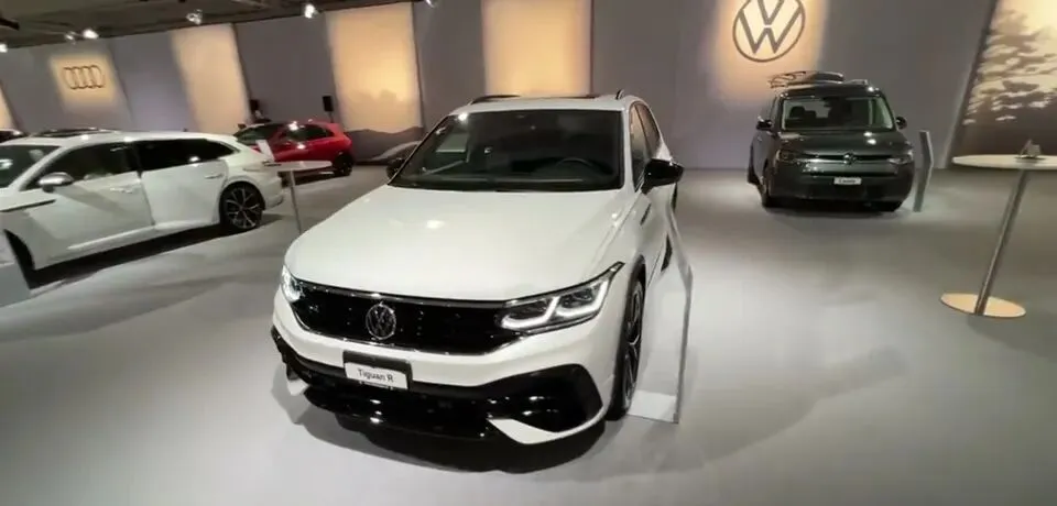 展示白色大众途观R的外观设计,包括前脸、车灯和轮毂。