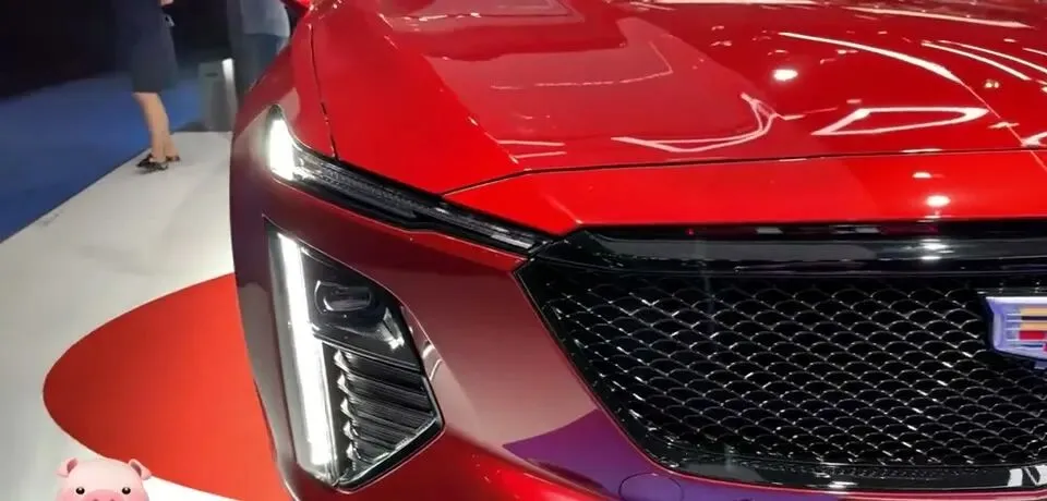 展示红色凯迪拉克GT4的外观,包括前脸设计和车身线条。