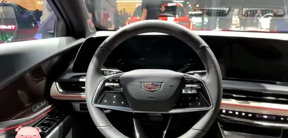 展示凯迪拉克GT4的内饰设计,包括方向盘和中控台。
